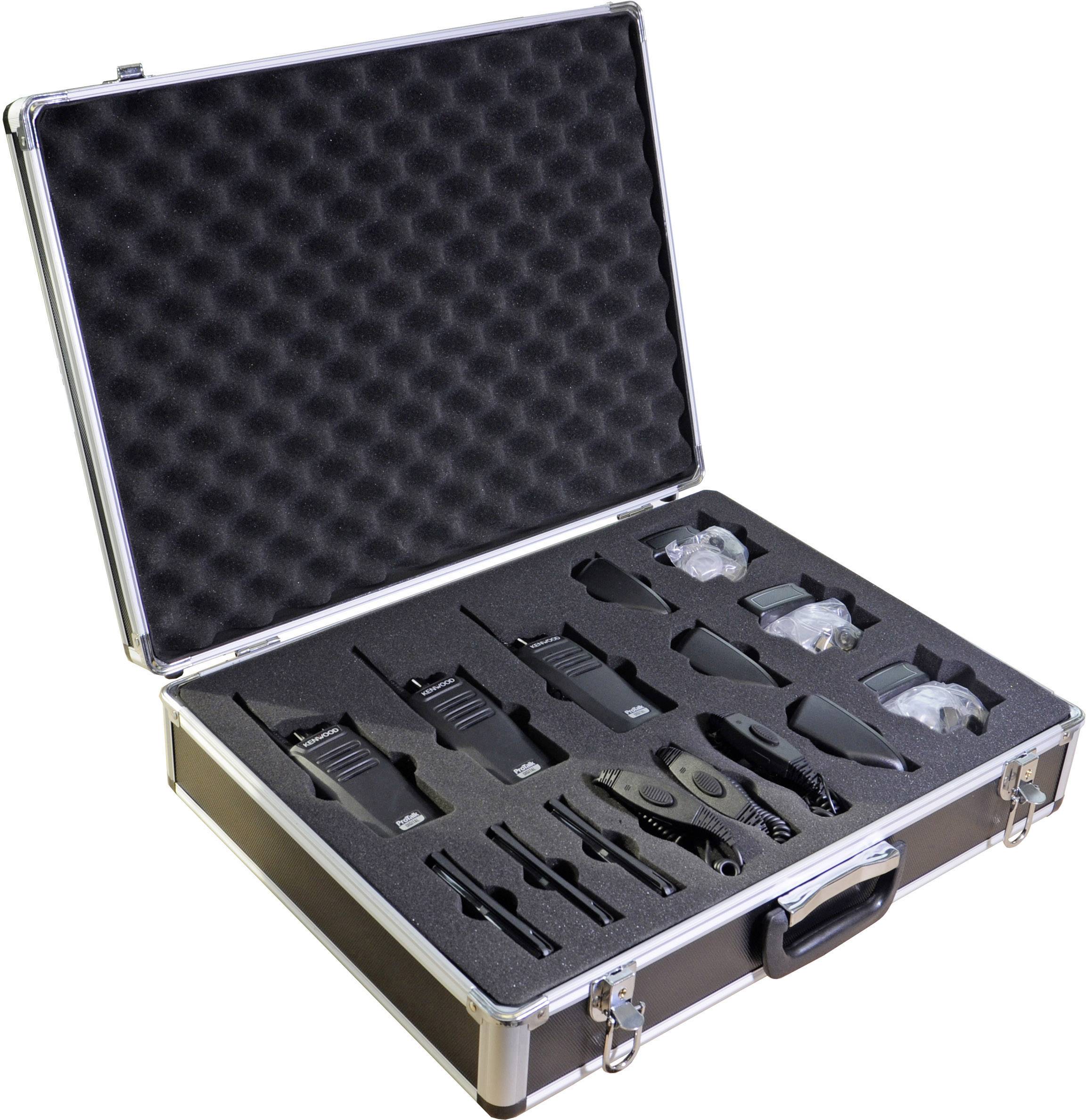 Drei TK-3401D werden in einem praktischen und stabilen Alukoffer zusammen mit Ladegeräten und passenden Security-Headsets (Kenwood "KEP-36") geliefert.