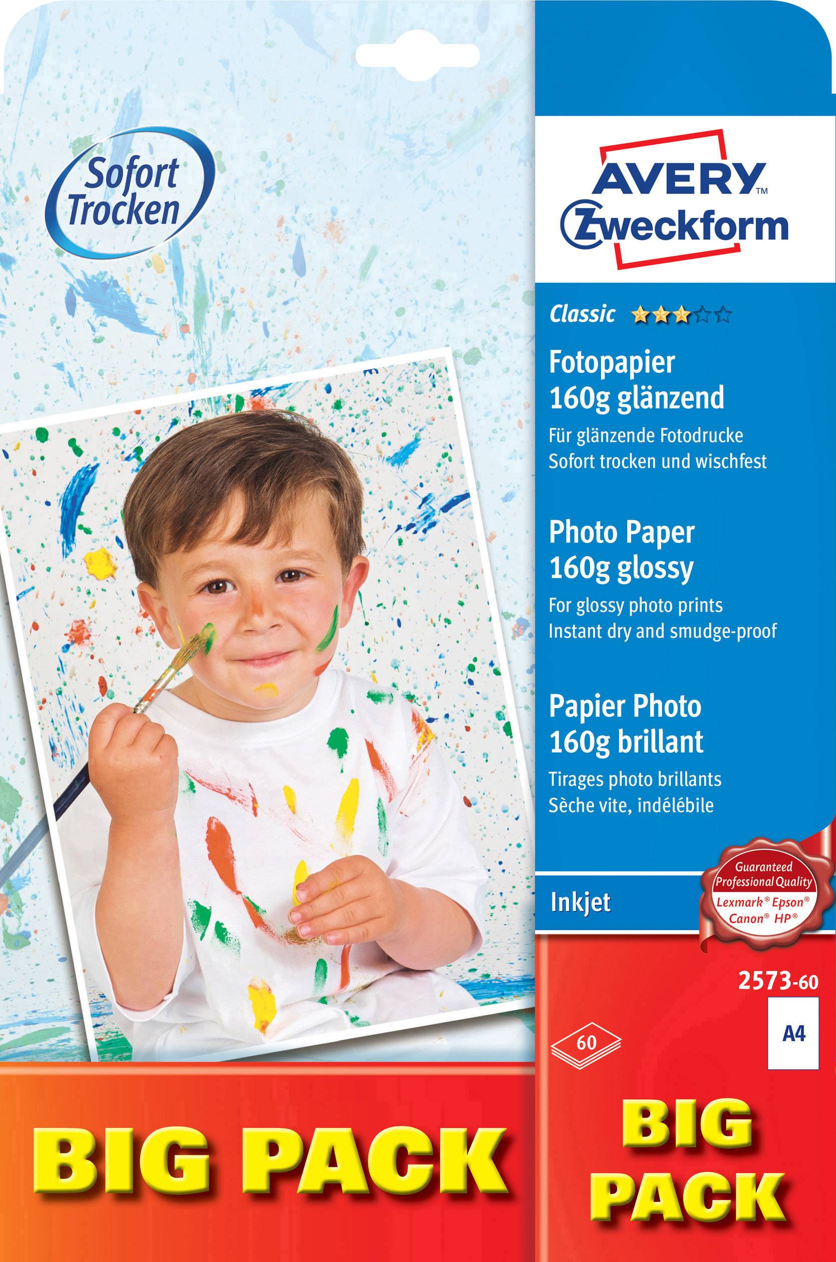 Mit dem Classic Inkjet Fotopapier 2573-60 (Big Pack) von AVERY ZWECKFORM im DIN A4 Format können Sie Ihre Schnappschüsse und Fotos schnell und einfach ausdrucken. 60 Blatt Fotopapier pro Packung. Die spezielle, glänzende Fotobeschichtung des Fotopapieres ermöglicht die Darstellung natürlicher Farben. Der Ausdruck ist dank effektiver Trockenformel sofort trocken und wischfest. Das Fotopapier mit einer Grammatur von 160 g bietet garantierte Qualität auf allen gängigen Druckermarken.