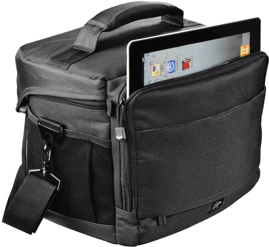 Tasche zum Schutz und zur sicheren Aufbewahrung einer Kamera mit Zubehör und eines Tablet-PCs · Hauptfach mit Reißverschlussöffnung · flache Vordertasche mit Netzfach und zwei Einschubfächern für z.B. Batterien · Reißverschlussfach auf dem Deckel · 4 Speicherkartenfächer unter dem Deckel · zusätzliches Reißverschlussfach unter dem Deckel · 2 Netztaschen an den Seiten außen · flexibel verstellbare Stativhalterungen unter der Vordertasche · 6 variable Inneneinteiler · 1 extra Bodeneinleger · Trolleyband an der Rückseite · gepolstertes Reißverschlussfach für Tablet-PCs an der Taschenrückseite · abwischbarer Boden · abnehmbarer und längenverstellbarer Schultergurt mit ergonomisch geformtem Schulterpolster · gepolsterter Tragegriff · Regenschutzhaube im unteren Bereich des Rückteils mit Klettverschluss integriert.
