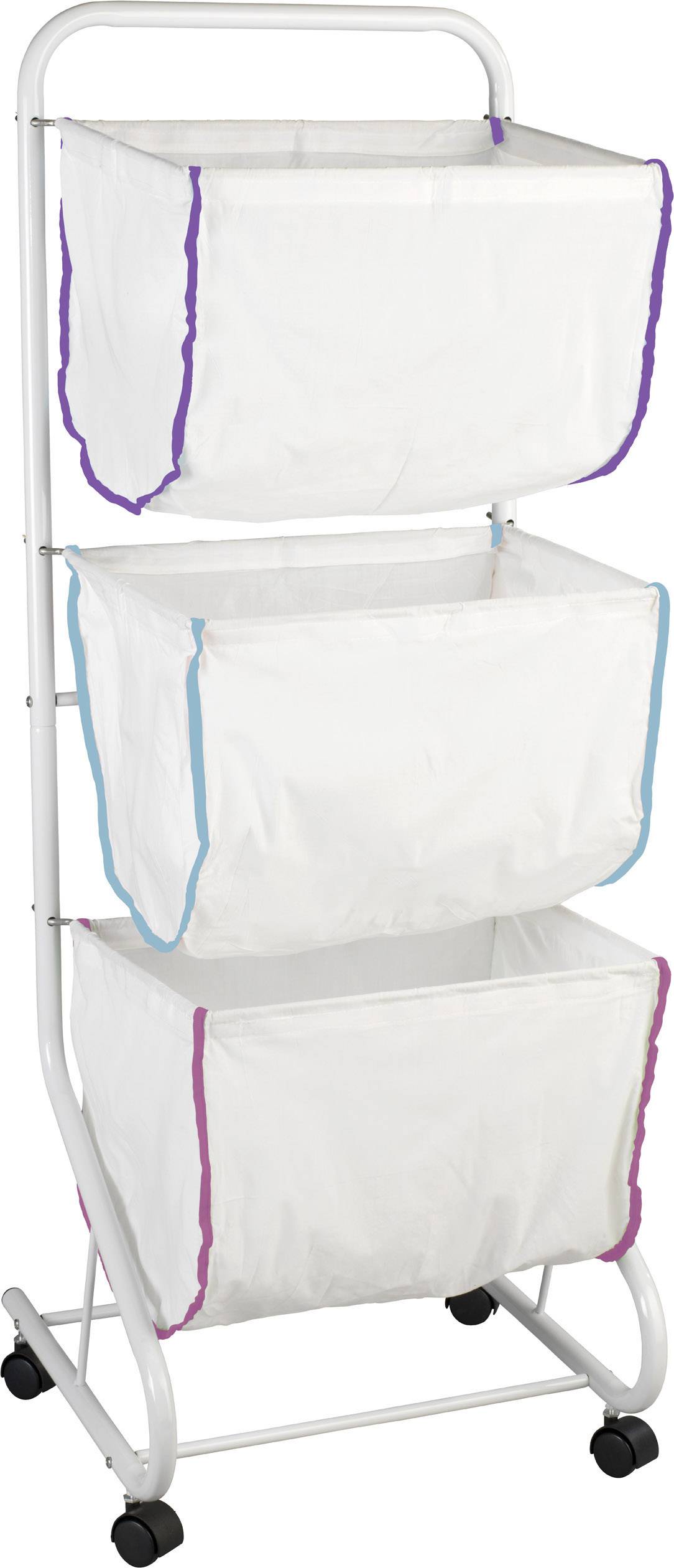 Auf vier montierten Rollen gelagert kann dieses Ständersystem aus pulverbeschichtetem Metall, ob leer oder gefüllt, problemlos in der ganzen Wohnung umher bewegt werden. Zusätzlich sind die drei aus einem Polyester/Baumwollgemisch gefertigten Wäschekörbe einzeln entnehmbar. So können gefüllte Körbe sofort entnommen und die darin befindliche Wäsche schnell gewaschen werden. Sammel- und Lagerzeiten bei der täglichen Wäsche werden so deutlich verkürzt.