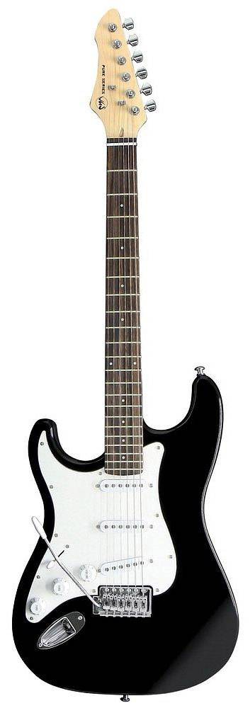 Lefthand, Black · Massiver Basswoodkorpus · Ahornhals, matt lackiert · Griffbrett Palisander, Neusilber-Bundstäbchen · Sattelbreite: 43 mm · Verchromte Hardware, ölverkapselte Mechaniken, Standard-Vibrato · 3 Single Coils, 5-Weg Schalter, 1 Volumen-, 2 Tonregler · Pickup-Kappen, Knöpfe und Schlagbrett weiß · 2-Weg Bi-Flex Stahlstab