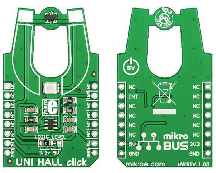 Das UNI HALL Click™ bietet eine einfache Lösung, um Ihr Design mit einem unipolaren Schalter zu versehen. Es verfügt über den Melexis US5881, einen unipolaren Hall-Effekt Schalter, und den 74LVC1T45 - einen Single-Bit-Transceiver mit dualer Versorgung. Der unipolare Hall-Effekt-Sensor des UNI HALL Click™ reagiert auf nordpolige Magnetfelder - wird das Gerät einem solchen Feld ausgesetzt, dann zeigt der Logikpegel am Ausgang 'LOW'.