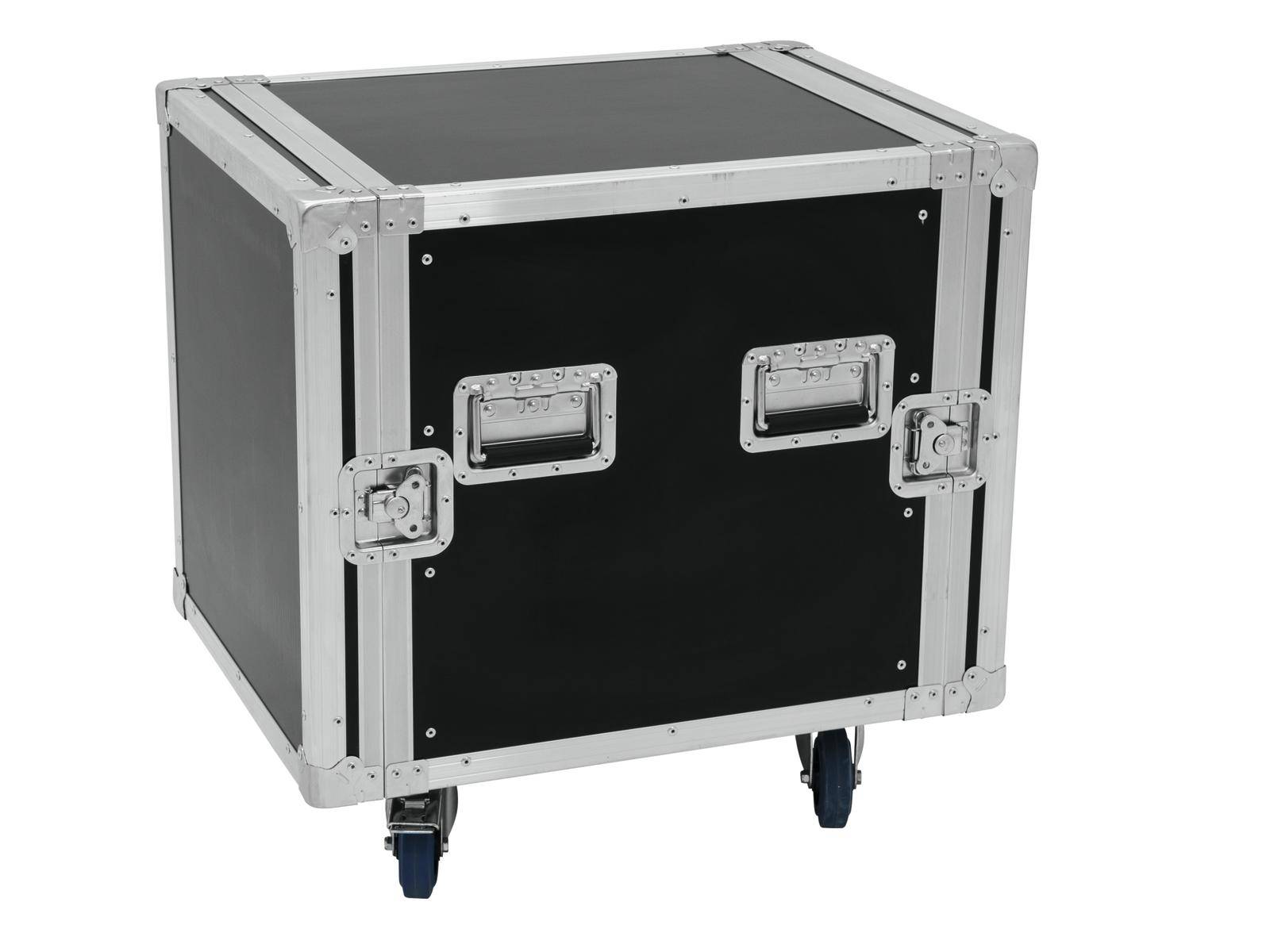 Rackschienen mit Montagemöglichkeit für 483-mm-Geräte (19""), wie leichte Endstufen, Lichtendstufen, Zusatzgeräte · Gestanzte Rackschienen für Käfigmuttern · 2 abnehmbare Deckel (Double-Door-Version) · Hochwertige Verarbeitung mit 9 mm mehrschichtig verleimtem Birkenmultiplexholz, dunkelbraun laminiert · Aluminiumprofilrahmen (30 mm) mit abgerundeten Ecken · Dreischenklige, mittelgroße Stahlkugelecken · 2 Case-Klappgriffe mit innen verstärkter Einbauschale · 4 Butterfly-Schlösser · 4 Rollen mit 2 Bremsen · In verschiedenen Höheneinheiten erhältlich (1 HE = 44 mm) · Made in Europe