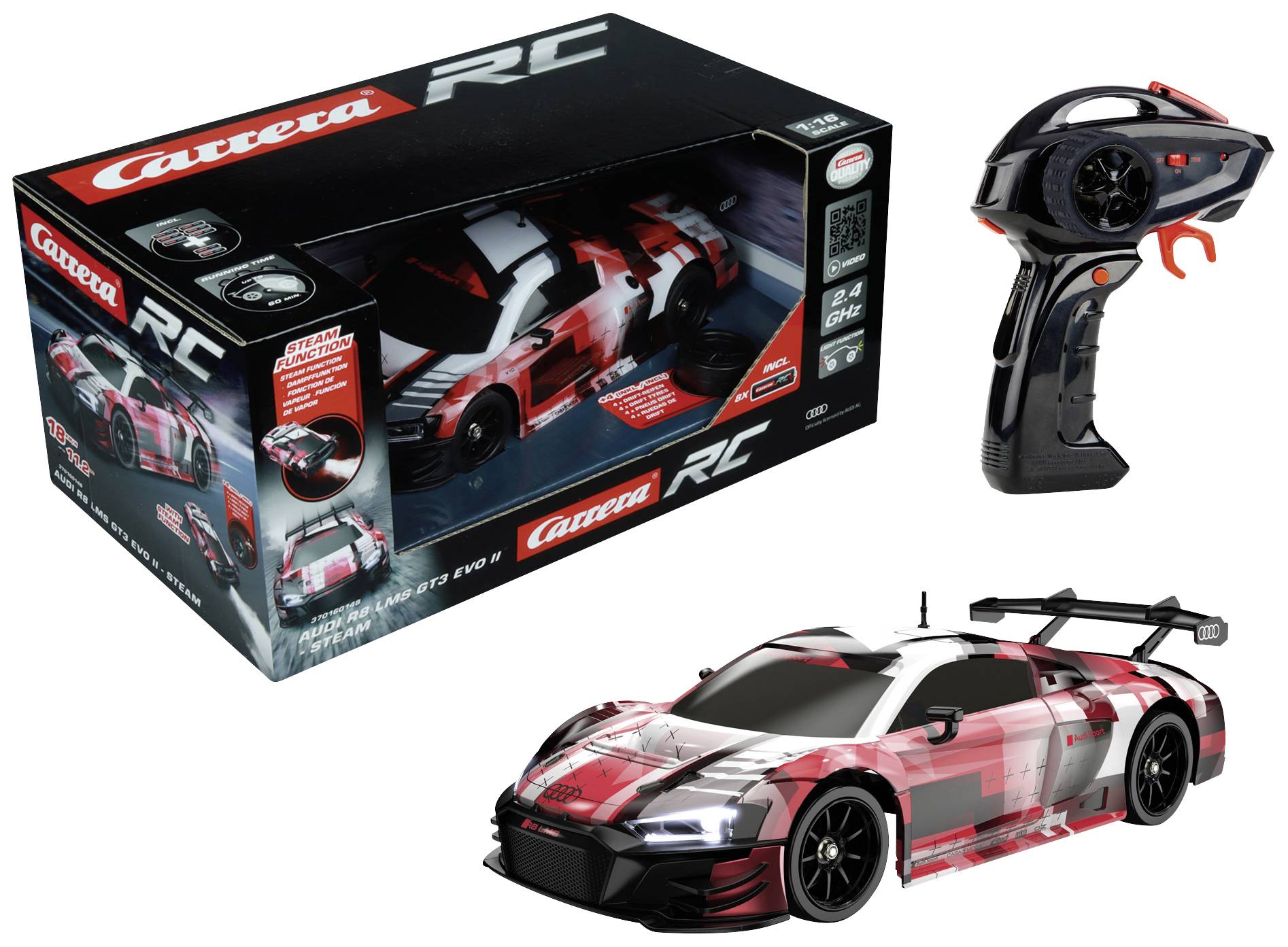 Entdecke den ultimativen Rennspaß mit dem ferngesteuerten Audi R8 LMS GT3 evo II von Carrera RC! Mit authentischem Design und störungsfreier 2,4 GHz Technologie bietet dieser Rennbolide ein atemberaubendes Fahrerlebnis. Aktiviere die Dampffunktion per Knopfdruck für qualmende Reifen und beeindrucke im Nachtrennen mit dem LED-Licht. Der 28 cm lange Audi R8 ist vollgefedert, verfügt über Luftreifen und erreicht eine Top Speed von 18 km/h. Mit einer Laufzeit von bis zu 30 Minuten ist er bereit für actiongeladene Rennen. Perfekt als Geschenk für Kinder, Audi-Liebhaber und Sportwagenfans. Greife jetzt zu und erlebe den Nervenkitzel des Audi R8 bei Carrera RC!