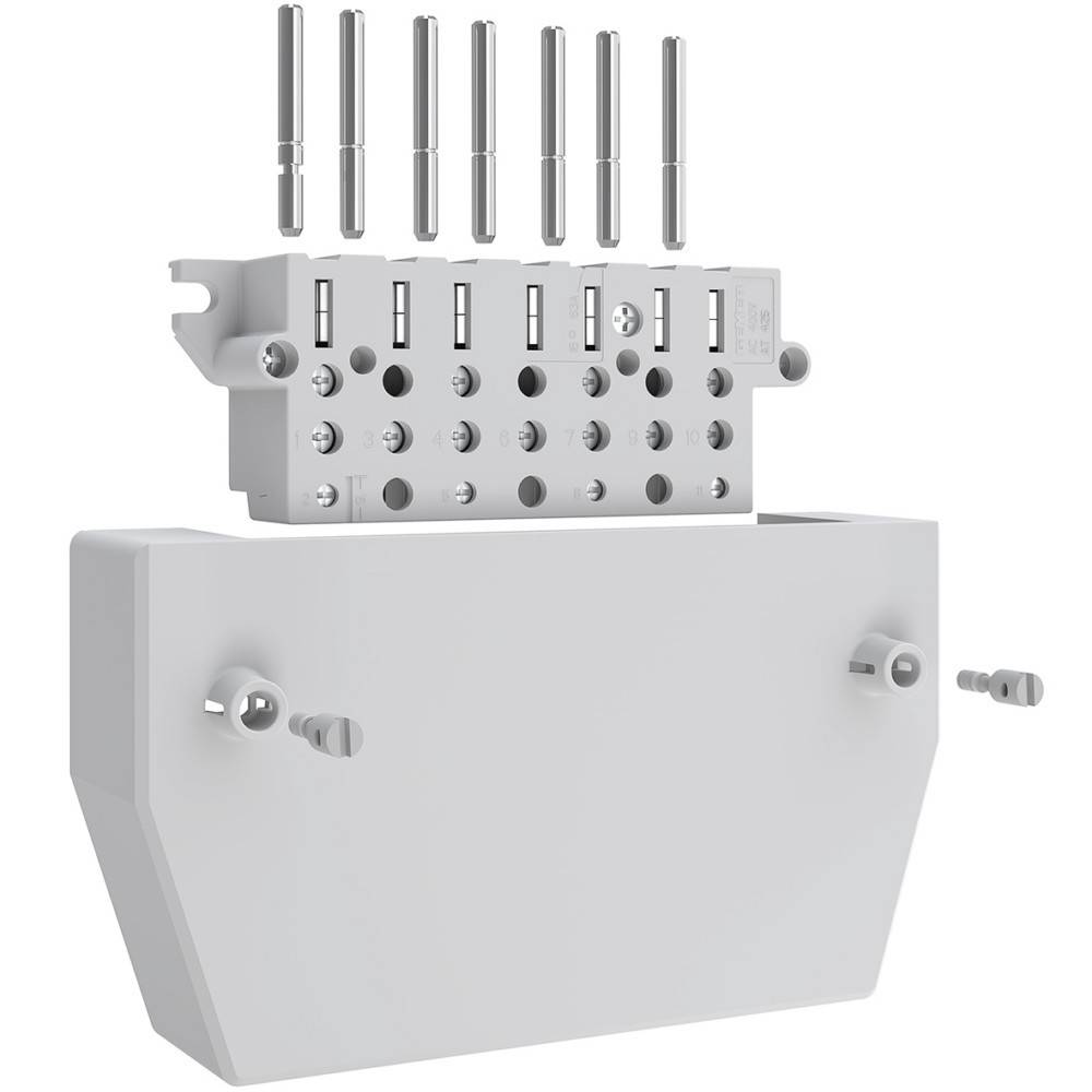 Zählersteckklemme mit Steckstifte und Klemmenabdeckung für 3 Phasen Drehstrom, geprüft nach DIN VDE 0603-3-3, für das schraublose Wechseln von haushaltsübliche Bezugszähler (63 A) in 3-Punkt-Befestigung, Klemmenquerschnitt bis 16 mm², Steuerleitungsabgriff pro Phasen- und N-Klemme, Set mit 7 Kontaktstiften mit Arretierung N-Stift 6x 45 mm und 1x 45 mm, plombierbar und mit Berührungsschutzabdeckung bei demontierten 3 Phasen-Wechselstromzähler