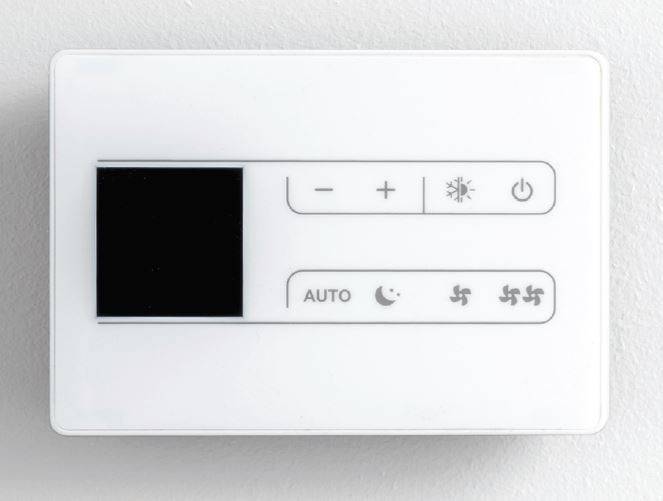 Smart Touch Regler zur Wandmontage Der Smart Touch Regler GKSRW2w lose geliefert und ist nur in Kombination mit GKSRPW2 zu verwenden. Er besteht aus weißem ABS. Funktionsbeschreibung der elektronischen Regelung Der Smart Touch Regler ist in zwei Bereiche eingeteilt, zum einen das Display und zum anderen das Touch-Bedienfeld. Im Touch-Bedienfeld, kann die Solltemperatur erhöht oder gesenkt werden, der Betriebsmodus eingestellt und das Gerät ein bzw. ausgeschalten werden. Es sind verschiedene Betriebsmodi verfügbar: Nightshift Modus Um den Komfort zu maximieren indem der Schallpegel minimal gehalten wird läuft der Ventilator auf der niedrigsten Drehzahl, bis der Sollwert erreicht ist. Gleichzeitig reduziert bzw. erhöht sich der Sollwert automatisch nach der ersten und zweiten Stunde um 1°C hin zur Ist-Temperatur. Somit wird ein möglichst leiser und energiesparender Betrieb sichergestellt. Eco Modus Im Eco Modus ist die Ventilatordrehzahl auf eine minimale Drehzahl. Max Modus Im Max Modus wird die höchste Ventilatordrehzahl gefahren und somit wird die Maximale Heiz- bzw. Kühlleistung erbracht, sodass möglichst schnell die gewünschte Solltemperatur erreicht wird. Automatik Modus Im Automatik Modus erhöht bzw. reduziert sich die Drehzahl des Ventilators in Abhängigkeit der Abweichung des Istwerts zum Sollwert. Dabei ist die minimale Drehzahl auf die des Eco Modus begrenzt, bzw. aus und die maximale Drehzahl liegt beim Max Modus. Die Wahl des Heiz- oder Kühlmodus erfolgt automatisch und hängt von der Luft- und der Wassertemperatur ab. Liegt die Wassertemperatur nicht innerhalb der für den aktiven Modus vorgegebenen Grenzwerte, so wird der Ventilator abgeschaltet. Über das blinkende Kühl-, bzw. Heizsymbol meldet der Regler, dass die Wassertemperatur nicht zum gewünschten Betriebsmodus passt. Passt die Wassertemperatur zum Betriebsmodus, so leuchtet das entsprechende Symbol dauerhaft. Tastensperre Über eine Tastenkombination kann das Bedienfeld gegen unbefugte Nutzung gesperrt werden. Einstellen der Hintergrundbeleuchtung Wird der Regler längere Zeit nicht benutzt reduziert sich die Hintergrundbeleuchtung auf ein Minimum, sollte dies dennoch zu hell sein, so kann sie auch komplett ausgeschaltet werden. Fehlermeldung Mögliche auftretende Störungen werden durch Fehlercodes mitgeteilt: - Defekt des Raumtemperaturfühlers - Fehler, der an der Platine GKSRPW2 auszulesen ist Ein-/Ausgänge: Modbus Schnittstelle Technische Daten: Versorgungsspannung: 230V / 1Ph / 50Hz Einstellbarer Sollwert: 5°C ? 35°C Farbe: weiß Hinweis: Nicht nachträglich bestellbar!