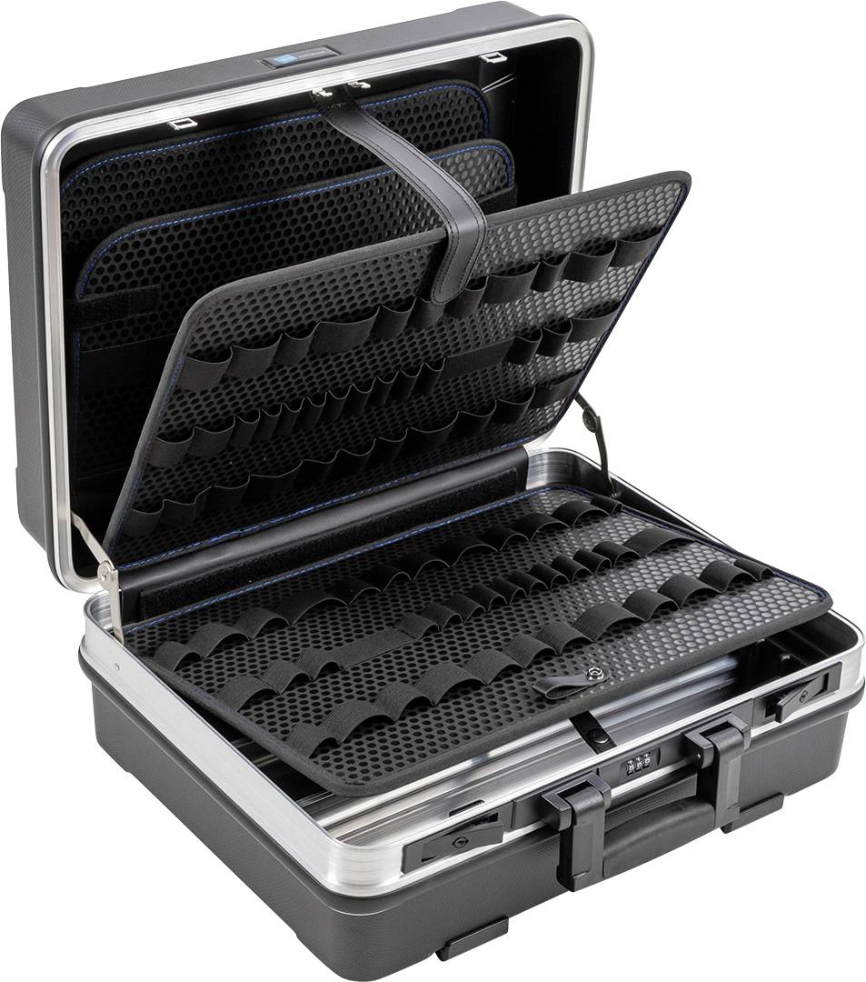 Werkzeugkoffer aus hochschlagzähem ABS-Material. Ein robuster Aluminiumrahmen mit Stoßkantenschutz schützt das Werkzeug und den Koffer. 2 abschließbare Kippschlösser sowie ein B&W PROFIcode-Zahlenschloss sorgen für Sicherheit. 4 zusätzliche Bodenfüße sorgen dafür, dass die Schale nicht zerkratzt und der Koffer besser steht. Ein robuster, angenehmer Griff sorgt für den nötigen Komfort beim Tragen des Koffers. Die Bodenschale ist variabel durch neue Trennstege aus Aluminium (2 Alu-Trennstege, 4 Endkappen, 2 Mittelkappen). Der flex loops enthält eine herausnehmbare Werkzeugtafel im Deckel mit elastischen Schlaufen auf Vorder- und Rückseite und eine herausnehmbare Abdeckplatte für die Bodenschale mit elastischen Schlaufen.
