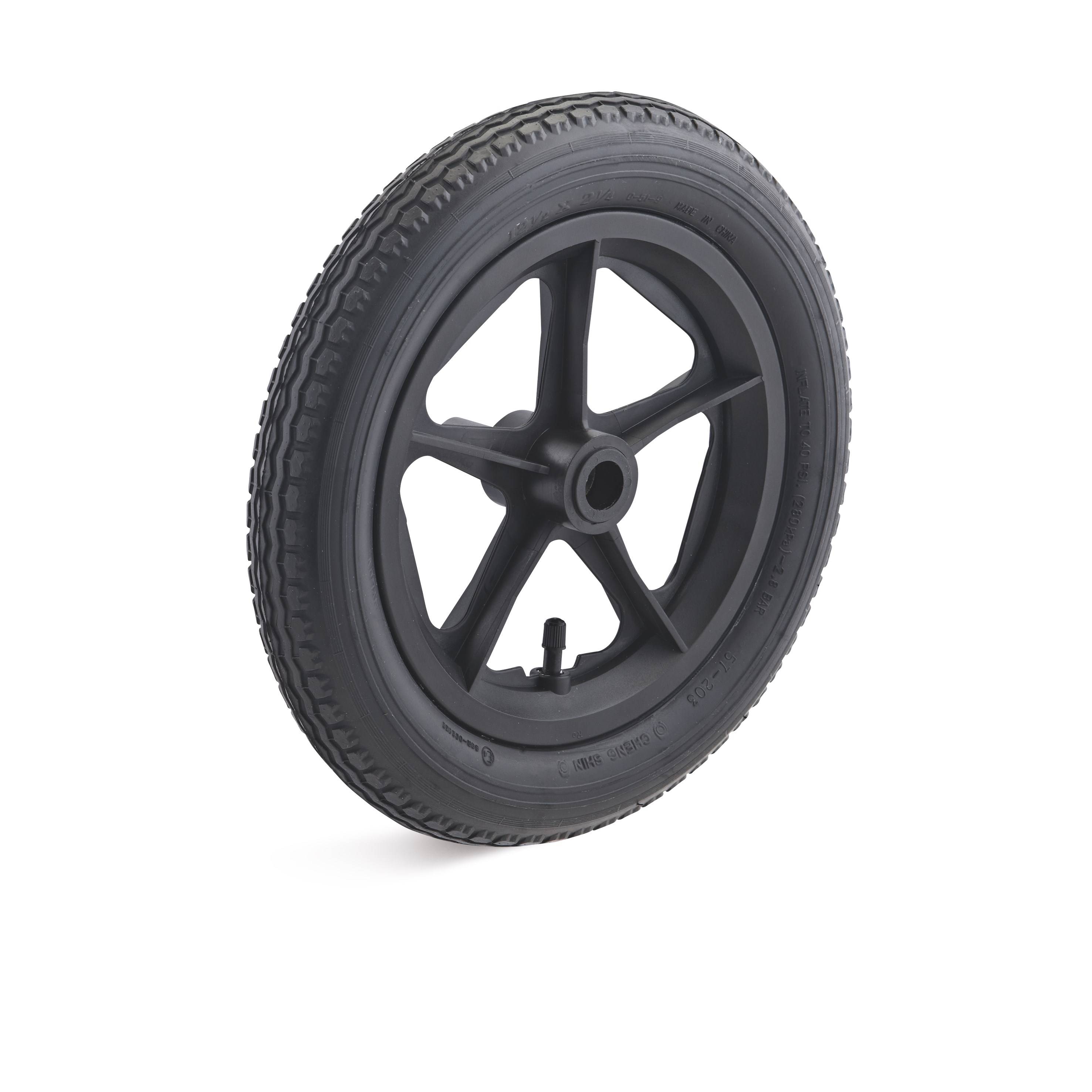 Luftrad mit Kunststoff-Felge, Gleitlager und Rillenprofil, Tragfähigkeit dynamisch: 75 kg, Rad-Ø: 310 mm, Radbreite: 50 mm, Luftbereifung Abmessung: 12 1/2 x 2 1/4 Zoll, Achsloch-Ø: 20 mm, Nabenlänge: 56 mm, Deckenprofil: Rillenprofil, Reifendruck: 2.5 bar, Radlagerung: Gleitlager, Laufflächen, Farbe: schwarz, Deckenstärke: 2-lagig Ply, Ident-Nr.0017364