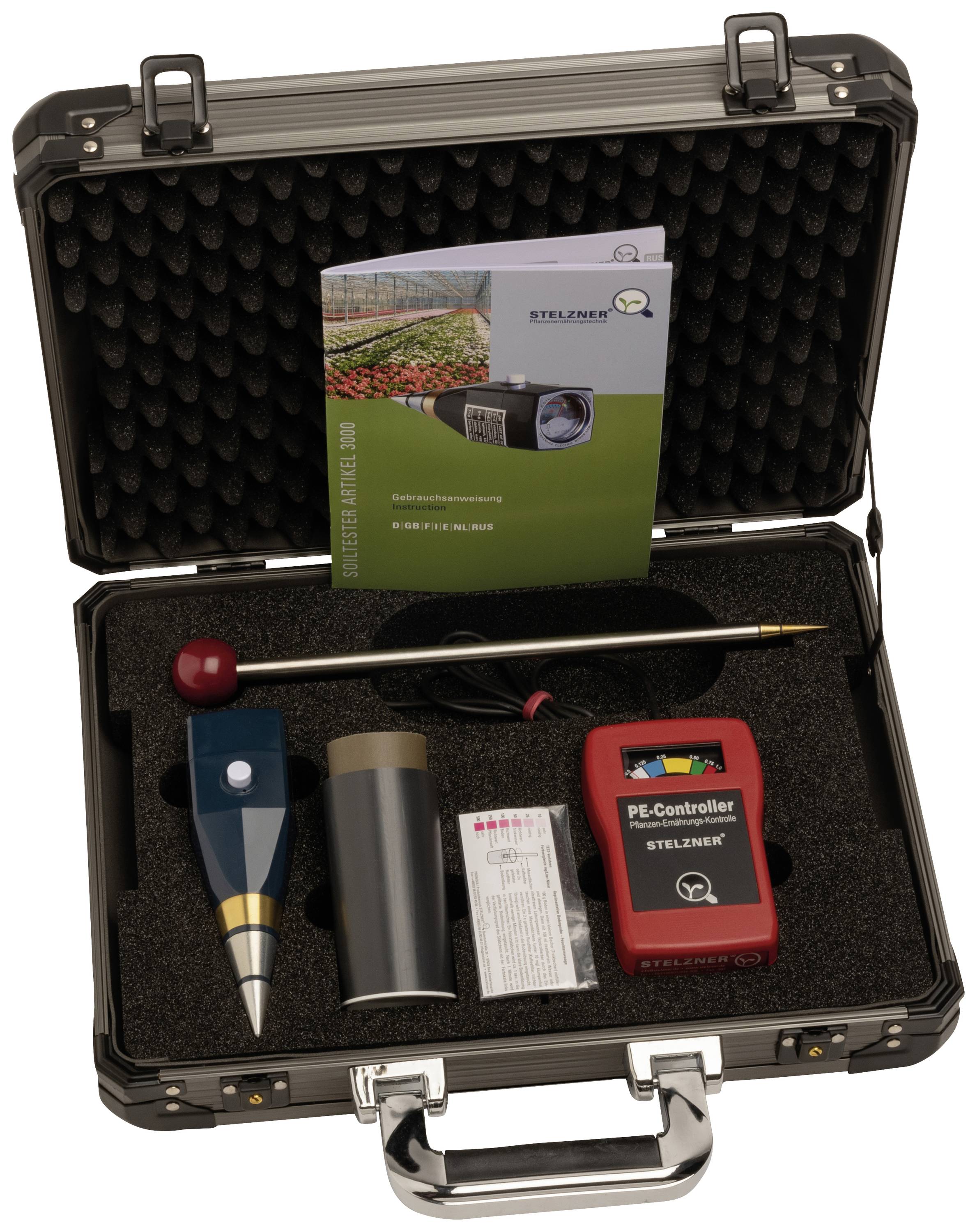 Der GaLaBau-Beratungskoffer enthält einen PE-Controller (Typ II) oder ein PET 2000 (Typ II+)mit AM-Sonde zur Bestimmung des Salzgehaltes (Aktivität) und einen Soiltester zur Bestimmung des pH-Wertes jeweils direkt im Boden. Die Aktivitätmessung erfolgt im Wurzelbereich unter Einbeziehung aller relevanten Bodeneigenschaften und wird auf einer Skala in Gramm Salz (Nährstoff) pro Liter Boden (Substrat) angezeigt. Somit läßt sich einfach und präzise die mögliche Nährstoffaufnahme im Boden durch die Pflanze ermitteln. Ein Mangel an Dünger oder Salzüberschuß (z.B. Streusalzeintrag) kann schnell sichtbar gemacht werden. Bei Messung von hohen Salzgehalten kann mit Hilfe von Nitratindikatorstäbchen zwischen Begleitsalzen und Nitrat unterschieden werden.