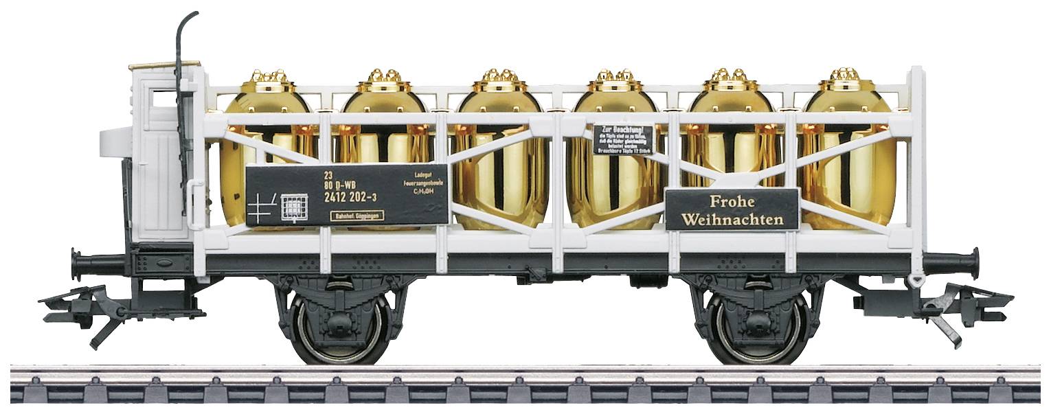Modell: Säuretopfwagen der Weihnachtsbahn (WB) in weihnachtlicher Gestaltung zum Transport von Feuerzangenbowle. Mit detaillierten, filigranen Fachwerksverstrebungen. Beladen mit 12 Säurebehältern. Die Säurebehälter sind mit 24-karätigem Feingold beschichtet. Zusätzlich eingesetztes Laufbrett zwischen den Säurebehältern. Angesetzte Leiter. Länge über Puffer 11,3 cm.Gleichstromradsatz E700580. Es ist die einzigartige Stimmung der Weihnachtstage, die Menschen zusammenbringt und uns gemeinsam die Freude am Geschenkemachen erleben lässt. Der goldene Glanz der Weihnachtzeit ist das perfekte Geschenk an alle, die im Einklang mit ihren Liebsten eine friedvolle und fröhliche Zeit miteinander verbringen.