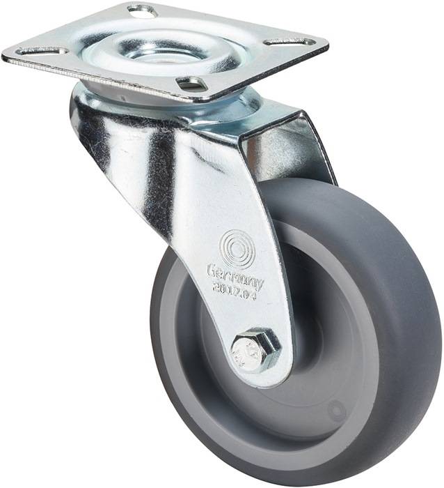 Apparaterolle · Gehäuse aus Stahlblech, verzinkt-chromatiert · korrosionsunempfindlich · zweireihiger Kugelkranz im Gabelkopf · thermoplastische Gummibereifung (grau) auf Kunststoff-Felge · Gleitlager · mit PlattenbefestigungWeitere technische Eigenschaften:· Oberfläche Gehäuse: verzinkt-chromatiert· Ergänzung: Standard· Material Gehäuse: Stahlblech· Plattenlänge: 60mm