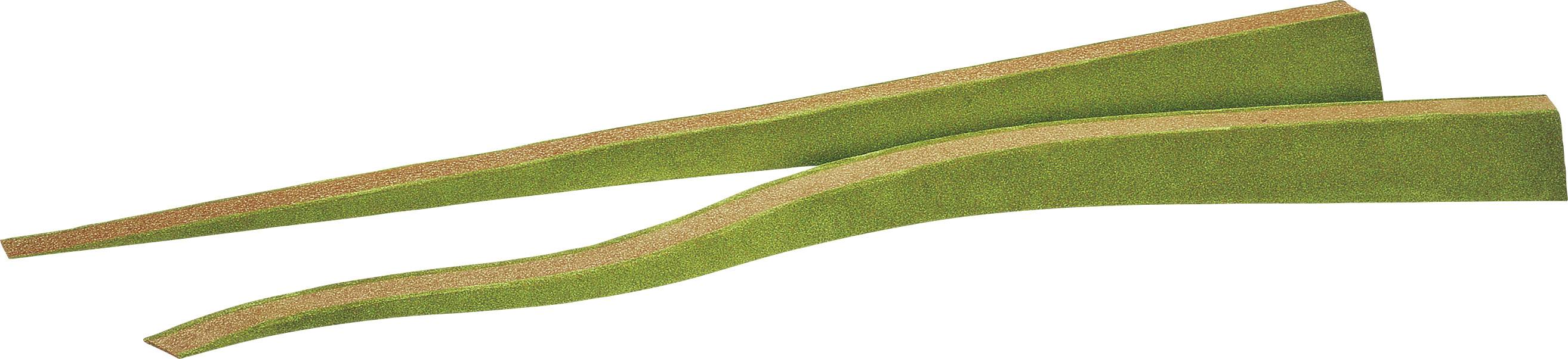 Die flexiblen Auffahrten werden als fertige Bahndammböschung mit Grasbeflockung und Schotterimitation geliefert. Die Auffahrten sind nach allen Seiten biegbar und können mit einem scharfen Messer leicht bearbeitet werden. Der Bahndamm wird entsprechend dem Streckenverlauf vorgebogen und kann dann mit Stecknadeln oder Klebstoffpunkten auf einer Grundplatte befestigt werden.