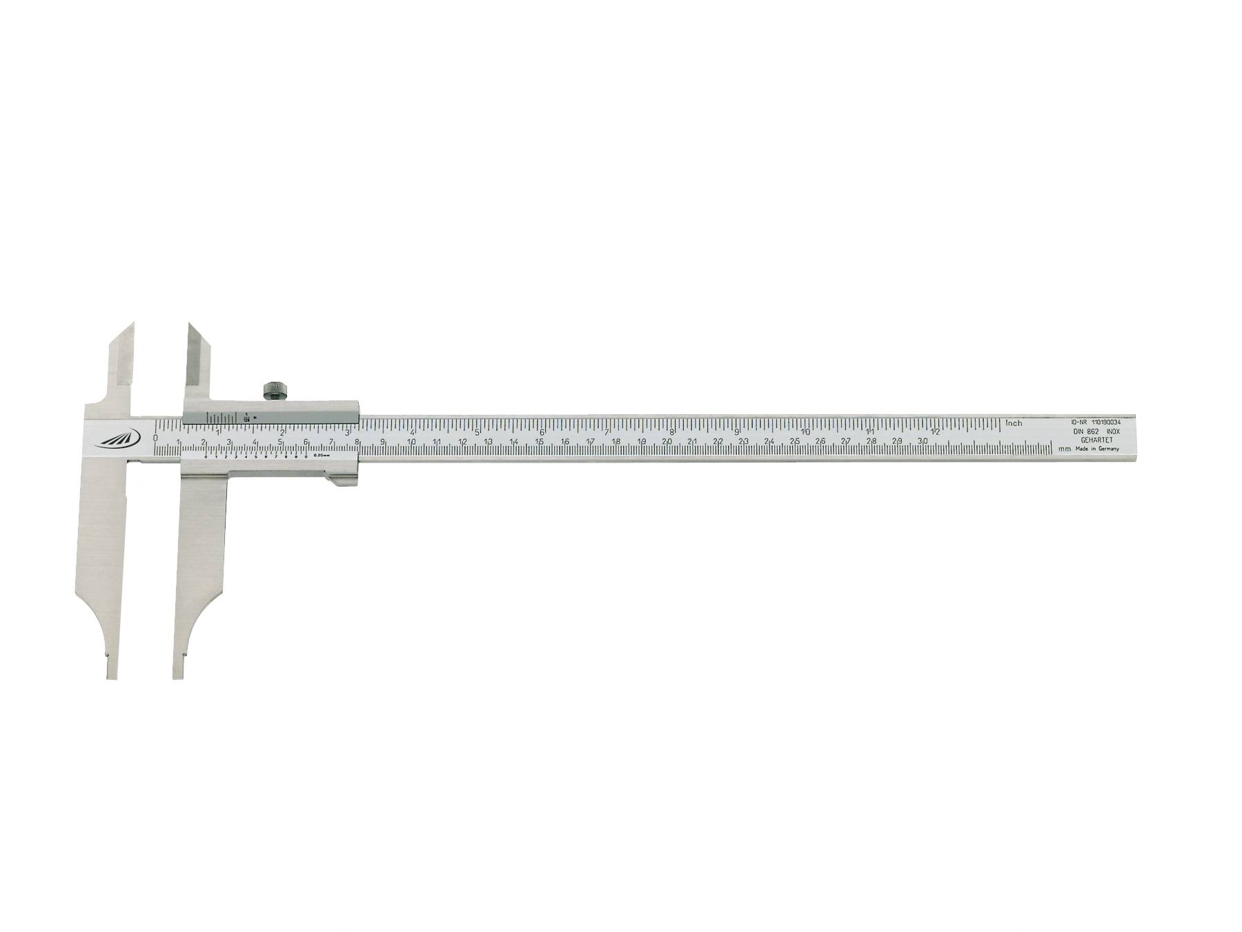 rostfreier Stahl · DIN 862 · mit Feststellschraube · Nonius und Skala mattverchromt · mit Messerspitzen · Ablesung mm und inch.