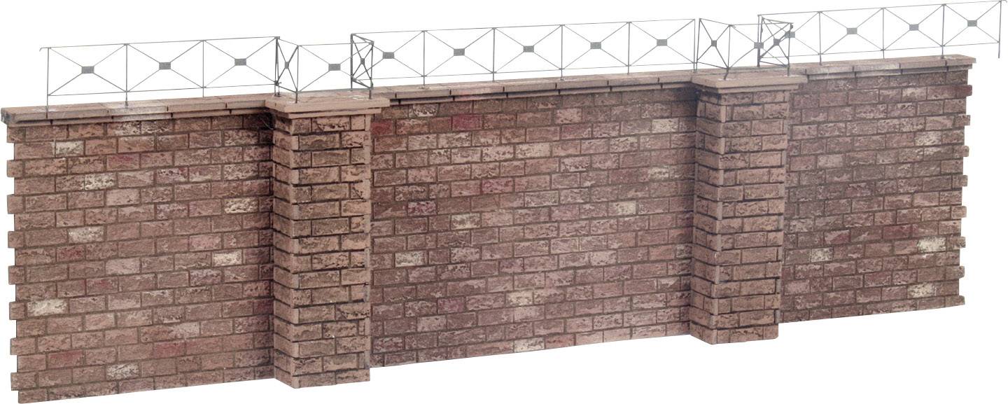 Unbemalte Stützmauer mit Geländer und 2 Wandpfeilern.