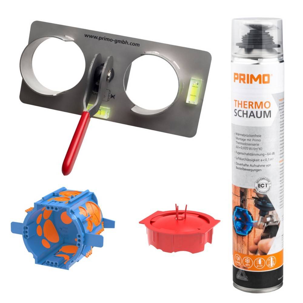Das Thermodosen-Set THDS-70-S2 besteht aus: 100 Stück Thermodose (P726), 100 Stück Universalputzdeckel (P722), 1 Stück Thermoschaum (P717) und 1 Stück Unterputzbohrschablone (P718).