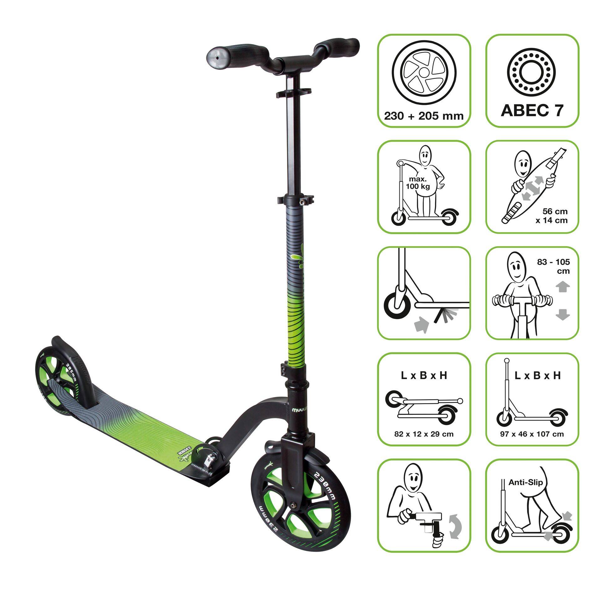 Großer Fahrkomfort: Mit einem Rollendurchmesser von 230 mm vorne/205 mm hinten und einem ABEC 7 Kugellager sind Sie auch auf unebenem Untergrund immer komfortabel und schnell unterwegs – super Komfort garantiert.