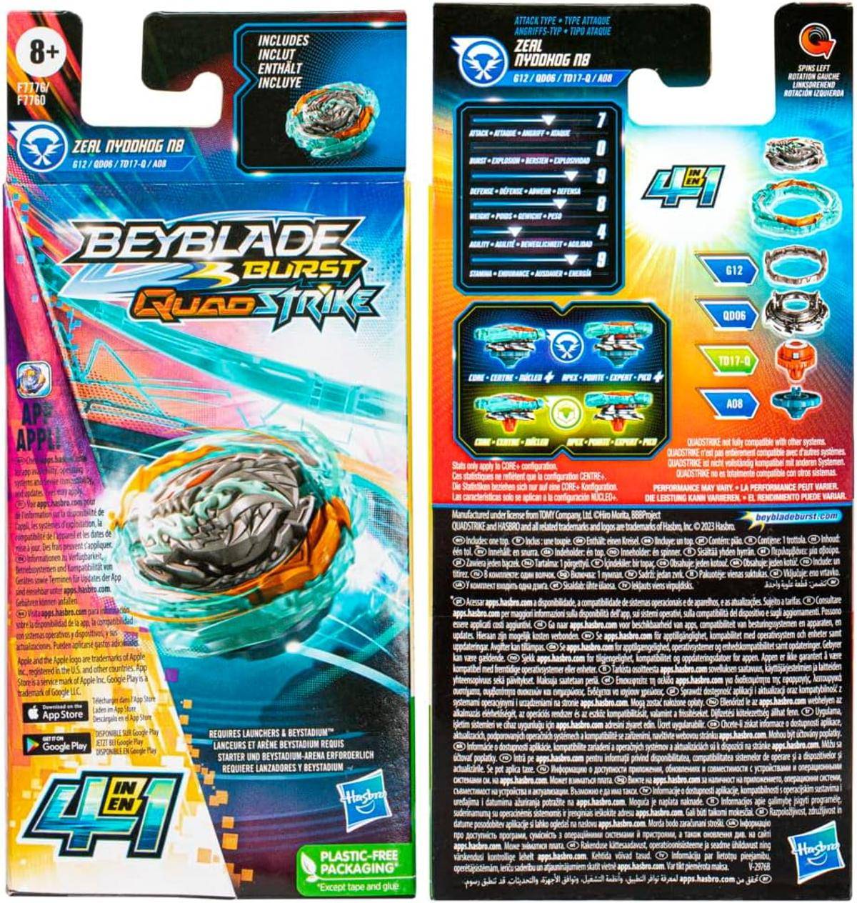 - Personalisieren Sie das Geschick: Enthält den Beyblade Burst QuadStrike Zeal Nyddhog N8 G12 QD06 TD17-Q A08 Linksdrehkreisel. Man kann den Typ des Kreisels ändern, indem man ihn im Mittel- und Spitzen-Modus (Verteidigungstyp) oder im Mittel- und Spitze+-Modus (Angriffstyp) konfiguriert