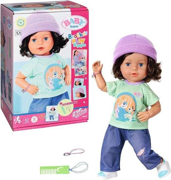 Zauberer war gestern – heute nennt man das Illusionist. Und die kommen auch nicht mehr im schicken Anzug daher, sondern im coolen Outfit. So wie der Brother. Der kleine Verwandlungskünstler trägt ein kariertes Shirt mit lässigem Druck, eine Hose in Jeansoptik und trendige Sneaker. Die schulterlangen Haare könnten zwar mit seinem Kamm frisiert werden, er trägt sie aber auch gerne lässig unter der lila Beanie. In seinem berühmtesten Zaubertrick hebt er die Arme nach oben und schaut ganz weit in den Bühnenhimmel. Das sieht Dank der mobilen Schulter- und Ellenbogengelenke und des beweglichen Kopfes sehr eindrucksvoll aus. Dann neigt er den Kopf blitzschnell nach unten, macht einen Hüftschwung und zack, weg ist er. Nach kurzer Zeit taucht er dann in der Badewanne wieder auf. Zwischen seinen magischen Tricks macht er immer ein paar Tanzeinlagen und schwingt die beweglichen Knie. Dabei bleibt er plötzlich stock-steif stehen – das nennt sich „Freeze“ beim Breakdance. • BABY born Brother • Mit sieben lebensechten Funktionen für große Spielfreude. • Ihm passt alles von BABY born. • Das abwechslungsreiche (Rollen-)Spiel mit BABY born fördert die Fantasie und unterstützt nachweislich die Entwicklung sozialer Fähigkeiten und Werte wie Verantwortung, Kommunikation und Einfühlungsvermögen. • Benötigt keine Batterien. BABY born Brother Style & Play 43cm mit Shirt, Hose, Schuhen und Mütze. Inkl. Kamm und je 1 Freundschaftsbändchen für Kind und Puppe.