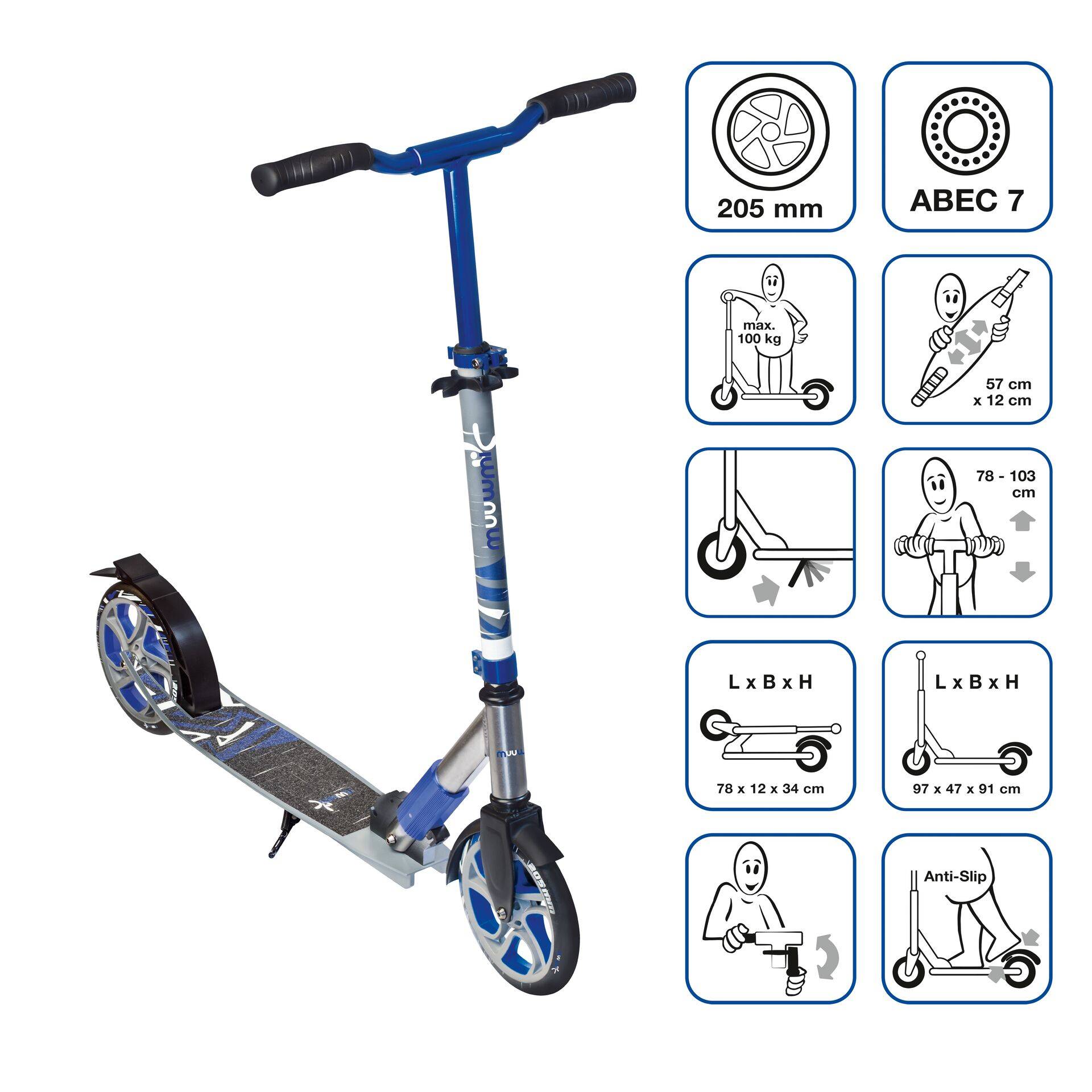 Großer Fahrkomfort: Mit einem Rollendurchmesser von 205 mm und einem ABEC 7 Kugellager sind Sie auch auf unebenem Untergrund immer komfortabel und schnell unterwegs.