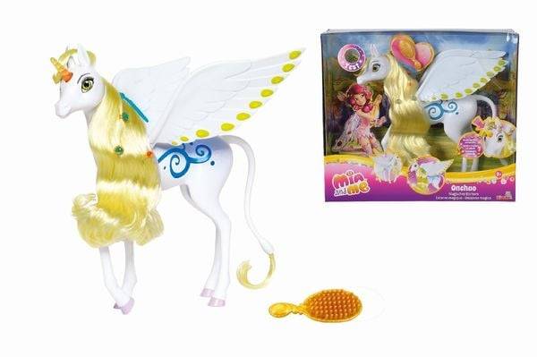 Einhorn Onchao, bekannt aus der Serie Mia and me, ist in der magischen Welt Centopia zuhause und einer von Mias besten Freunden. Onchaos Haarmähne kann mit der goldenen Bürste frisiert und mit den bunten Haarclips geschmückt werden. Zudem besitzt das Einhorn tolle bewegliche Flügel. Drückt man auf das Horn von Onchao, so beginnt es zusammen mit dem Muster auf seinem Körper farbig zu leuchten. Dabei wird der beliebte Titelsong der Serie gespielt oder aber Onchao wiehert. Das magische Einhorn Onchao ist 25cm groß und für Kinder ab 3 Jahren geeignet.