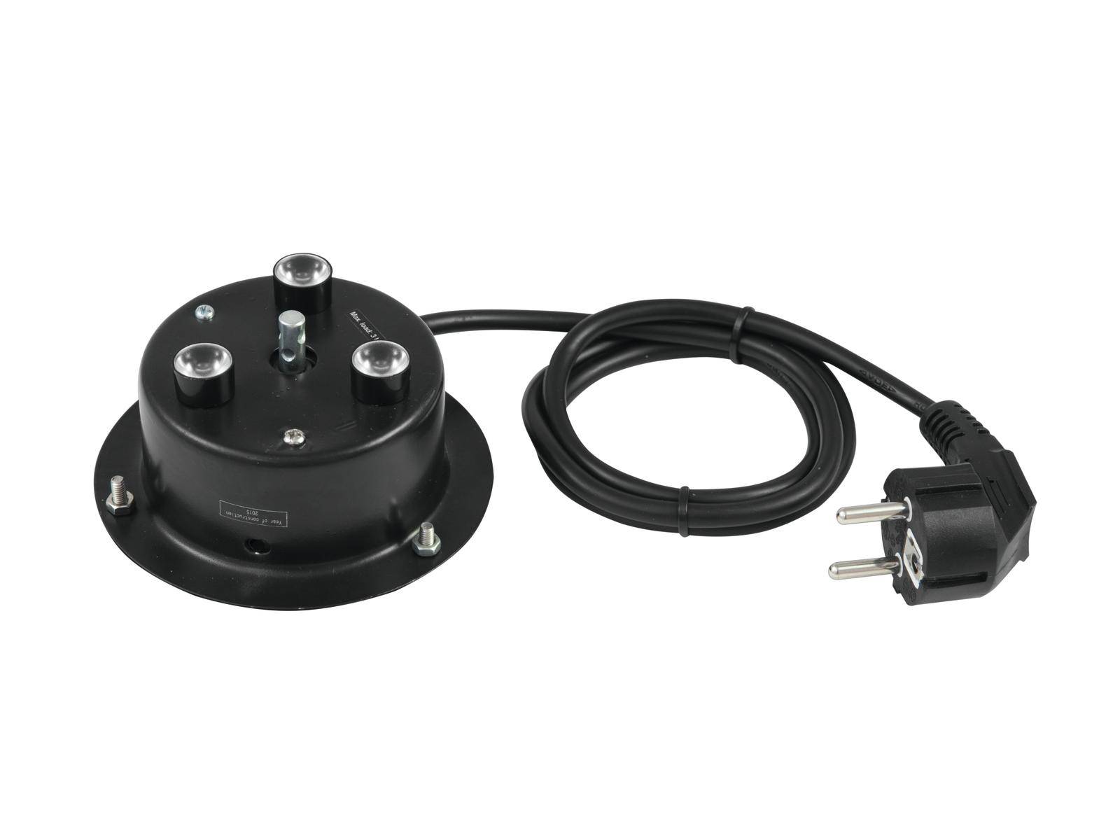 Spiegelkugelbeleuchtung und Drehmotor · Metallgehäuse mit 3 weißen LEDs bestückt, die statisch nach unten die Kugel anstrahlen · Zum Antrieb von Spiegelkugeln bis zu einem max. Gesamtgewicht von 3 kg · Dies entspricht bei EUROLITE Spiegelkugeln einem Durchmesser von 20 cm · Die max. Tragfähigkeit bezieht sich immer auf das tatsächliche Gewicht der Spiegelkugel inkl. Spiegelkugelkette und Befestigungsmaterial · 1,5 Umdrehungen pro Minute · Anschlussfertig mit Netzstecker · Für den professionellen Einsatz, z. B. in Diskotheken und Versammlungsstätten, müssen unbedingt die Bestimmungen der BGV C1 (vormals VBG 70) eingehalten werden · Der Motor muss immer mit einer zweiten, unabhängigen Aufhängung installiert werden · Vor der ersten Inbetriebnahme muss die Einrichtung durch einen Sachverständigen geprüft werden.
