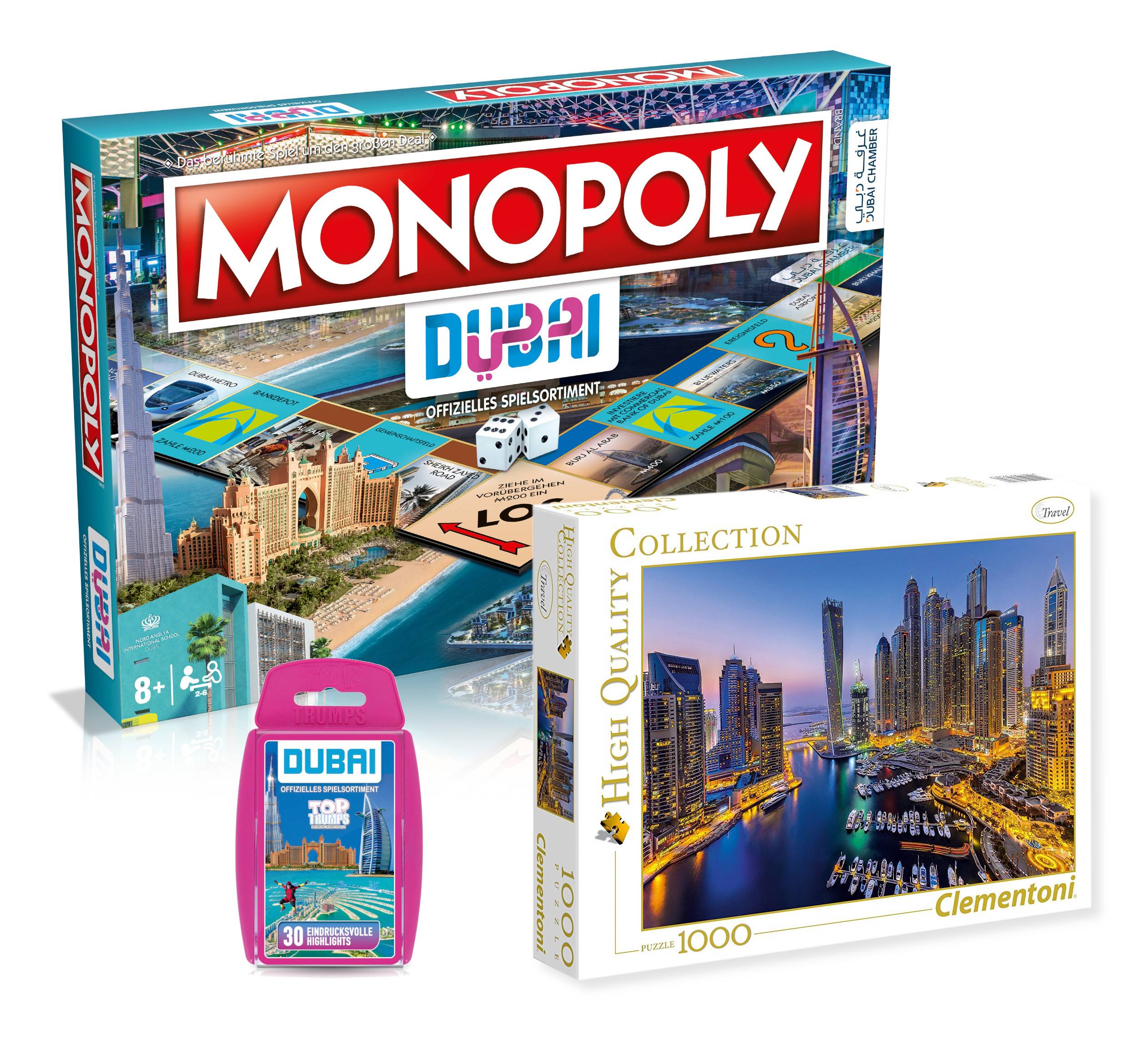 Bist du bereit für eine Reise durch Dubai? Und wolltest du nicht schon immer mal den Burj al Arab oder das Atlantis The Palm besitzen? Das ist ab jetzt möglich - mit dem brandneuen Monopoly Dubai! Entdecke die Wunder Dubais von der Sheikh Zayed Road über den Dubai Miracle Garden bis hin zur Bluewaters Insel. Und das Beste? Du kannst dir aus all' diesen Sehenswürdigkeiten, Verkehrsmitteln und Versorgungseinrichtungen dein eigenes Immobilienimperium aufbauen und so zum wohlhabensten Bürger Dubais werden.