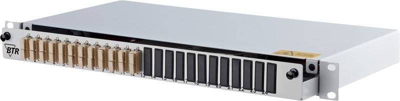 Das 19 Zoll, 1HE LWL-Patchfeld mit einer ausziehbaren Spleißablage/Frontblende, ist mit 12 SC-D Kupplungen bestückt, die mitgelieferten Pigtails sind bei der Lieferung bereits in die Standardspleißkassette mit Crimpspleißhaltern eingelegt und abgesetzt, die Pigtails sind zudem gereinigt und in Kupplungen eingesteckt. Der Auszug des Panels lässt sich abkippen und komplett herausnehmen (mit Auszugsstop), wodurch eine bessere Montage der Kupplungen ermöglicht wird. Es gibt mehrere Kabeleingangsmöglichkeiten auf der Rückseite des Panels. Die Befestigung des Kabels ist mit PG13,5, PG16 und PG21 bzw. M20 und M25 möglich. Dadurch, dass die Frontplatte abnehmenbar ist, ist die Kupplungsmontage sehr einfach.