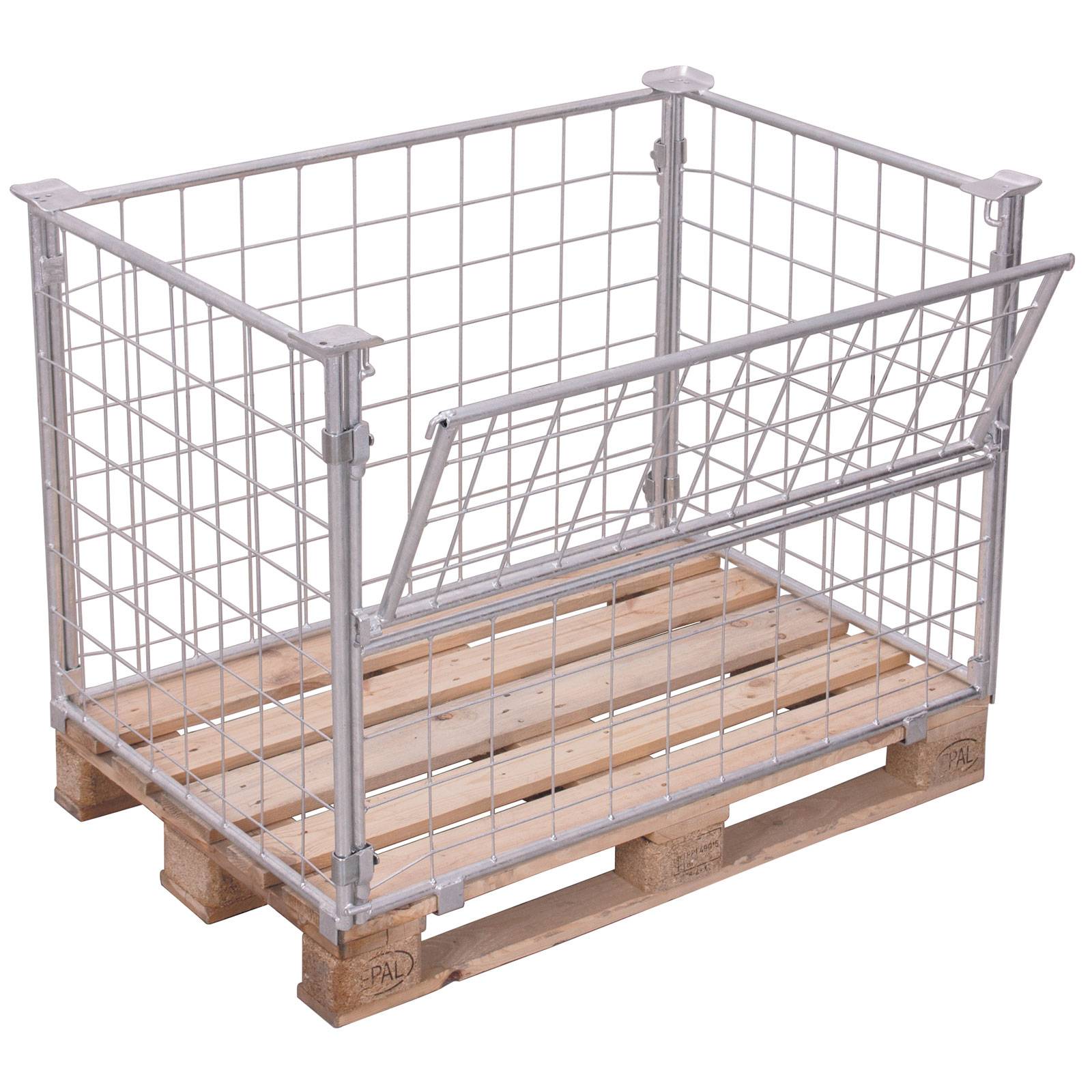 Typ 64 Palettenaufsatz für Europaletten bzw. Industriepaletten Schweißkonstruktion aus Stahl Passend für Euro- oder Industriepaletten Stapelbar, jedoch gestapelt nicht verfahrbar Vergittert, Maschenweite 100 x 100 mm Alle Seiten geschlossen 1 Längsseite davon halb abklappbar Optional einhängbare Trenngitter Bei Nichtgebrauch platzsparend zusammenleg- bzw. faltbar Hinweis Die Palette ist nicht im Lieferumfang enthalten