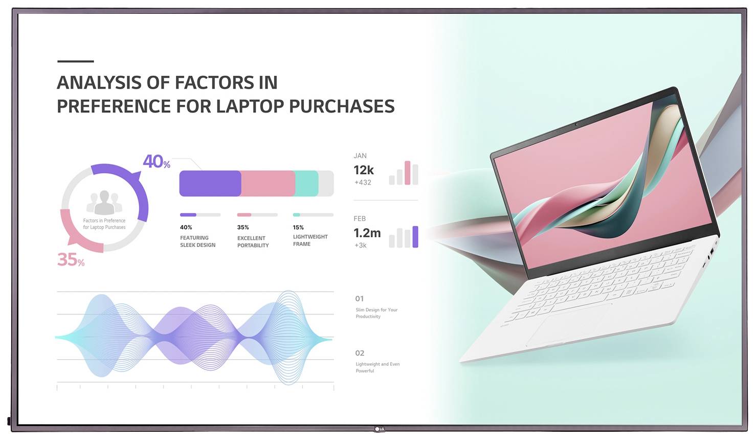 UHD 3840 X 2160 IPS - 120 Hz - 500 nit - webOS 6.0 - HDMI - DP - DVI-D - Audio In - RS-232C - RJ45 - USB - Wi-F - 1682.4×960.3×57.9mm - 41.5kg