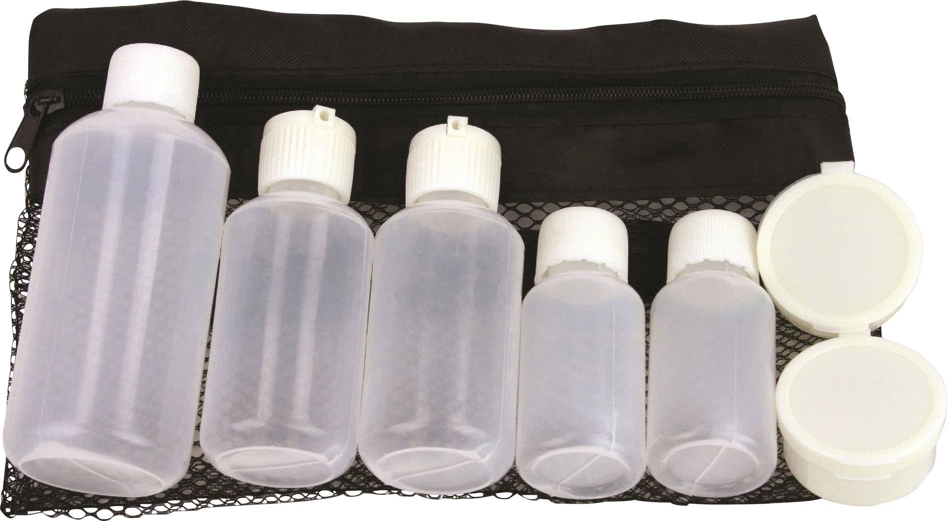 Praktisches Aufbewahrungsset für kleine Mengen! Die leichten Aufbewahrungsflaschen aus Kunststoff werden in einem Transportbeutel aus Netzgewebe geliefert. Sie sind perfekt dazu geeignet kleine Mengen Creme, Shampoo, Duschgel, Medikamente, etc. abzufüllen und somit das Reisegepäck zu reduzieren. Das Set beinhaltet 1 Flasche 120 ml mit Deckel, 2 Flaschen 75 ml inkl. Deckel mit Spritzfunktion, 2 Flaschen 25 ml mit Deckel und 2 kleine Dosen mit Deckel. Bis auf die 120 ml Flasche sind alle Behältnisse bei einem Flug auch für das Handgepäck geeignet (Grenze je Behältnis 100 ml). Dazu müssten sie nur in einem transparenten Beutel verpackt werden.