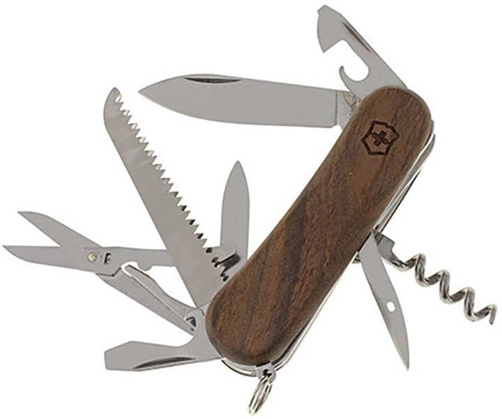 Schweizer Taschenmesser mit Schalen aus Nussbaum und 13 Funktionen.