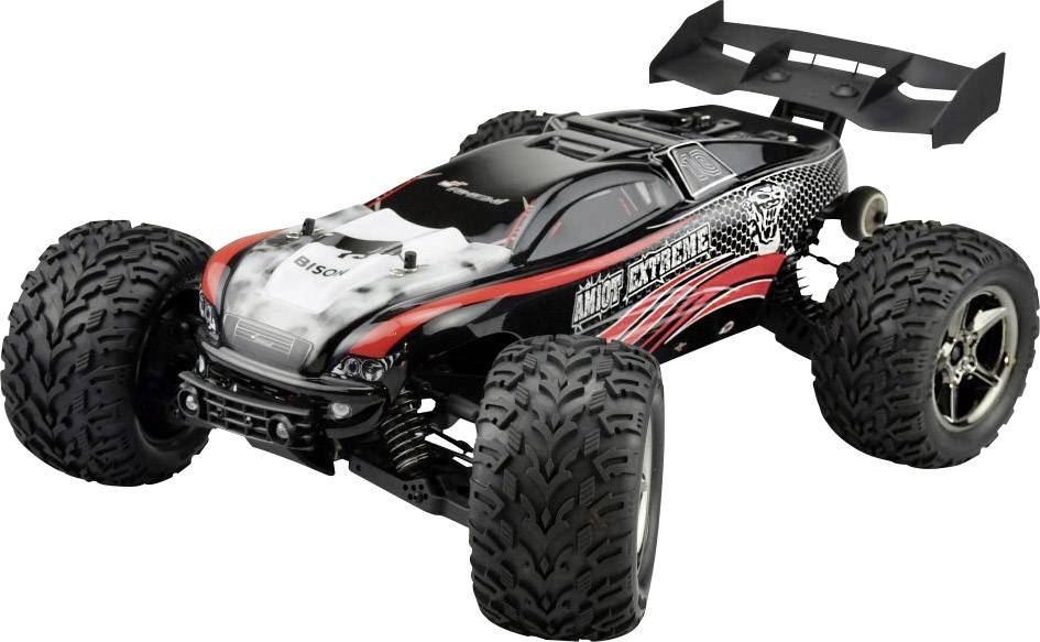 AM10T Extreme- mehr Leistung geht nicht! Als Antrieb dient einer der schnellsten 1:8er Motoren(2650KV) mit einem 120A Regler. Ein Dampfhammer auf einem leichten Chassis. Der 4-Zellen Antrieb eines 1:8ers in einem 1:10 Fahrzeug setzt neue Maßstäbe in Sachen brutaler Leistungentfaltung und katapultiert den AMTX mit atemberaubenden Wheelies nach vorn und zaubert dabei allen Speedfreaks ein breites Lächeln ins Gesicht! Dieser außergewöhnliche Truggy basiert auf der Grundlage von professionellen Wettbewerbsfahrzeugen. Ausschließlich erstklassige Komponenten und Bauteile hoher Materialgüte wurden verwendet.