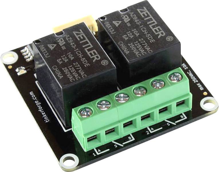 Mit dem Dual Relay Bricklet können Bricks um zwei Relais erweitert werden. Jedes Relais besitzt drei Anschlüsse, der mittlere wird zwischen den beiden äußeren umgeschaltet. Der Schaltzustand wird jeweils durch eine LED angezeigt. Die neue Hardwareversion 1.2 ist mit umfangreicher Schutzbeschaltung gegen Störungen durch Schalten induktiver Lasten ausgestattet.