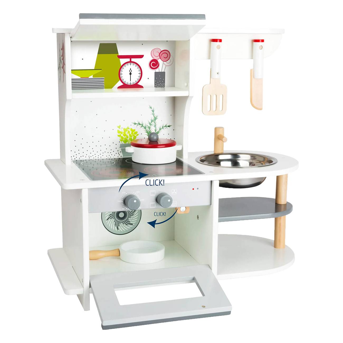 Alle kleinen Köche an den Herd. Hier kommen hungrige Mäuler auf ihre Kosten! Der Backofen ist mit einer aufklappbaren Tür ausgestattet, die Temperaturregler klicken beim Drehen und das Waschbecken aus Metall ist herausnehmbar. Mit den passenden Kochutensilien können wie in einer richtigen Küche allerlei Leckereien spielerisch zubereitet und gekocht werden. Der Küchenschrank bietet Platz für die leckeren Lebensmittel aus dem Tante Emma-Laden. So lässt sich alles platzsparend verstauen. Eine Kinderküche, die auf kleinen Spielflächen ganz groß rauskommt.