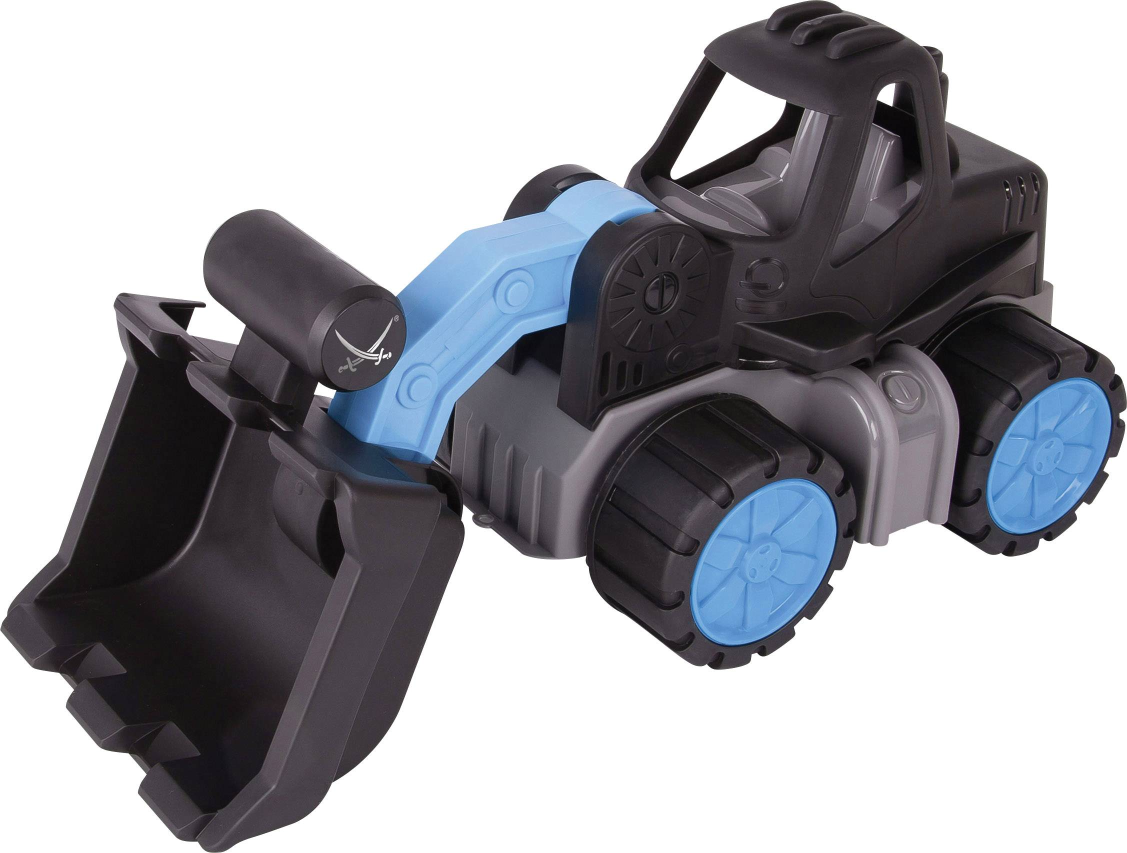 Der BIG-Power-Worker Radlader Sansibar ist das perfekte Spielfahrzeug für Kinder ab zwei Jahren und entführt diese durch sein piratenstarkes Design im Handumdrehen in ferne Fantasiewelten, in denen sich Piratenabenteuer mit großen Bauvorhaben verbinden. Der Name Sansibar erinnert an Wellen und Meer, an Piraten und Abenteuer und ist verbunden mit einem der beliebtesten Restaurants in den Dünen von Sylt. Edles Schwarz verbindet sich mit leuchtendem Blau und macht die kleinen Spielfahrzeuge zum Highlight auf jeder Spielbaustelle. Charakteristisch dafür stehen die zwei gekreuzten Säbel, die heute das Wappen des Kult-Restaurants sind. Mit seiner großen Schaufel, die ein Fassungsvolumen von bis zu 0,5 Litern aufweist, können die kleinen Buddelfans mit dem BIG-Power-Worker Radlader Sansibar im Handumdrehen Baugruben ausheben und das Material an die richtige Stelle schieben oder transportieren. Der Radlader ist speziell auf die Ergonomie kleiner Kinderhände abgestimmt, so dass Kinder den Radlader leicht schieben, transportieren oder die Baggerschaufel kippen können. Ein besonderes Extra sind die widerstandsfähigen Softreifen, mit denen alle BIG-Power-Worker serienmäßig ausgestattet sind. Diese schonen den Bodenbelag und färben nicht ab, so dass das Spielen überall möglich ist.