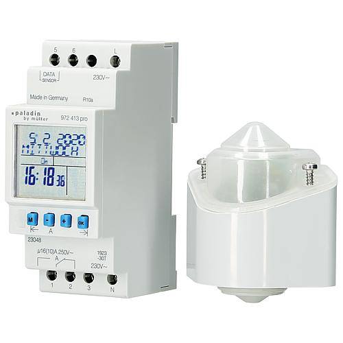 1-Kanal Dämmerungsschalter mit Tagesprogramm und separatem Lichtfühler für die Montage auf Tragschiene DIN-EN 60715 TH35. Typ: 972 413 pro Anschlussspannung: 230 V / 50 - 60 Hz Schaltleistung: 16 A Einstellbereich Schalthelligkeit: 1 - 1.000 Lux Schaltfunktionen: Lux, Nacht AUS, Tag EIN 30 Speicherplätze 10 Jahre Gangreserve bis zu 30 Permanentschaltungen nach Datum / Ferienzeit automatische Sommerzeitumstellung Sicherheit durch PIN-Codierung beleuchtetes Display Schutzklasse II Maße (H × B × T): 45 × 35 × 58 mm programmierbar mit dem Smartphone via NFC: App - Save´n Carry (kostenloser Download) Lampenlasten:Glühlampen, Halogenlampen: 2000 WLeuchtstofflampen mit EVG: 1000 WLeuchtstofflampen mit KVG: 550 WEnergiesparlampe, LED: 200 W