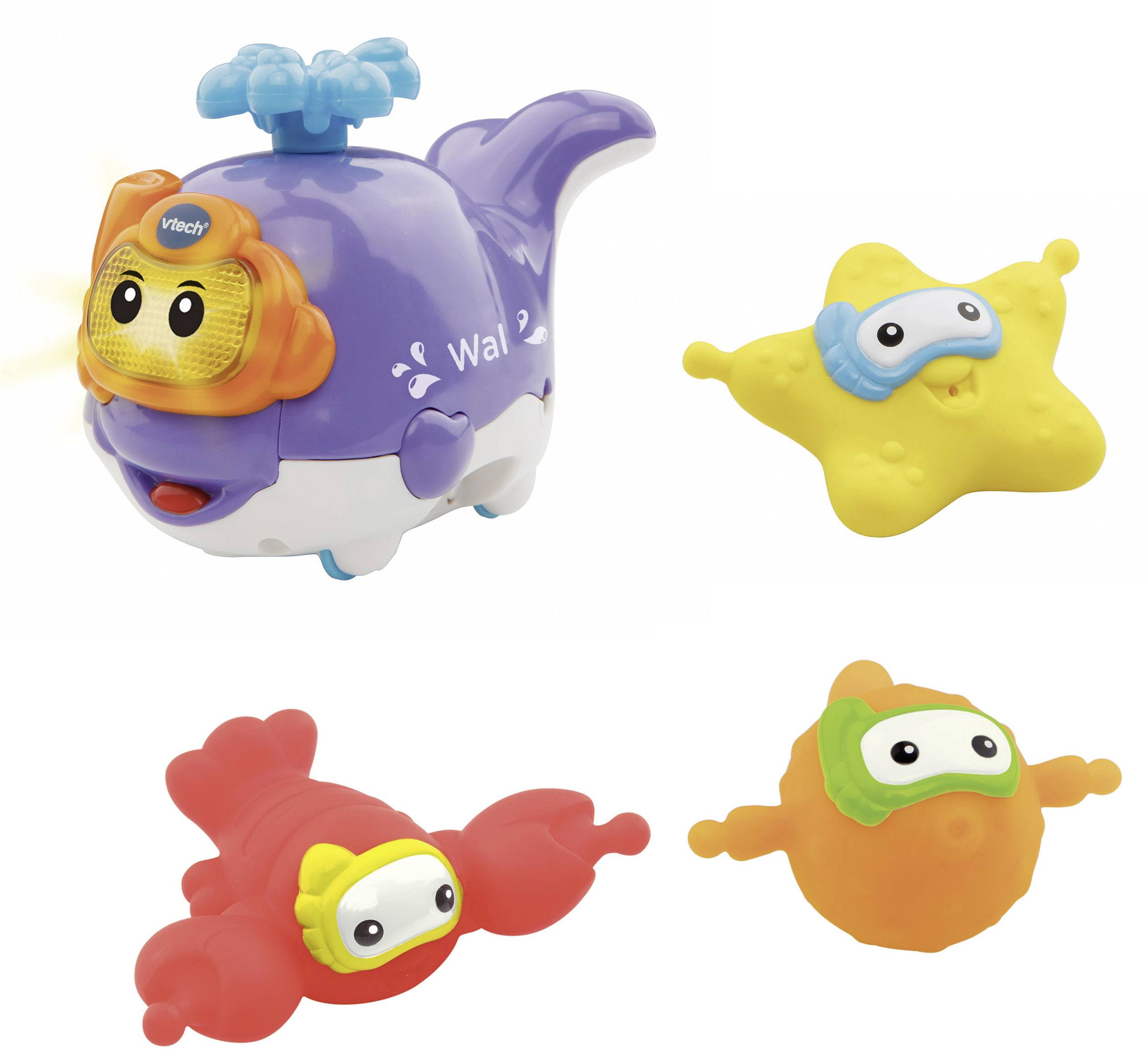 Mit den Badewelt Ozeantieren von VTech ist Unterhaltung in der Wanne garantiert! Diese tollen Wasserspielzeuge bereiten den Kleinen nicht nur jede Menge Spaß, sondern fördern auch die sensomotorischen Entwicklung und animieren zu fröhlichen Spielen. Werden die Räder des Wals bewegt, ertönen lustige Geräusche, Melodien oder ganze Sätze. Die drei wasserspritzenden Meerestiere können mit dem Wal verbunden werden