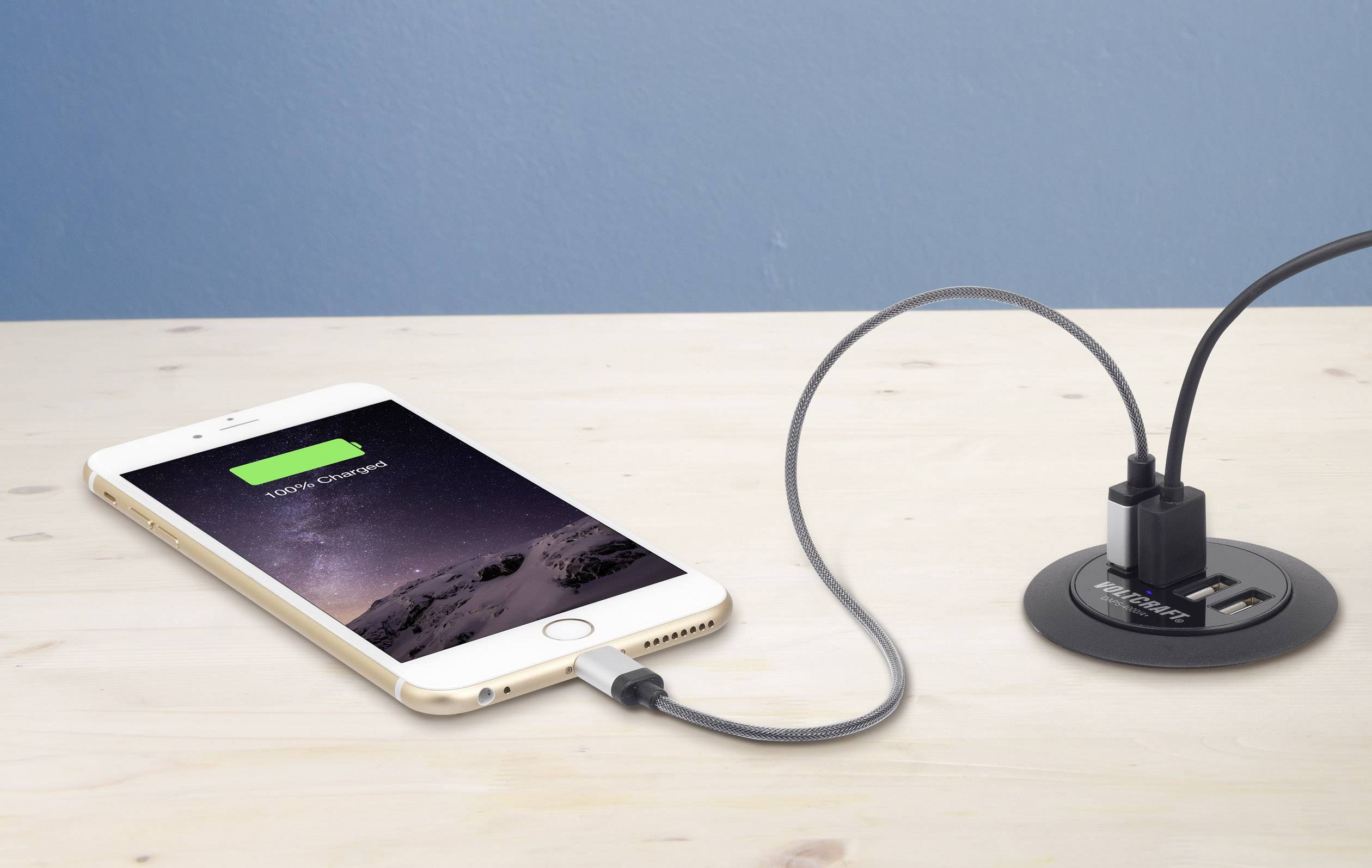 Das netzbetriebene Einbau-Ladenetzteil enthält 4 hochstromfähige USB-Ausgänge mit einem maximalen Ladestrom von je 2400 mA. Die Hochstrom-Ausgänge können für schnellladefähige Geräte wie iPad® etc. gleichzeitig verwendet werden, wenn die maximalen Werte der einzelnen Ausgänge oder der Gesamtstrom von 6000 mA bzw. die Gesamtleistung von 30 W nicht überschritten wird.