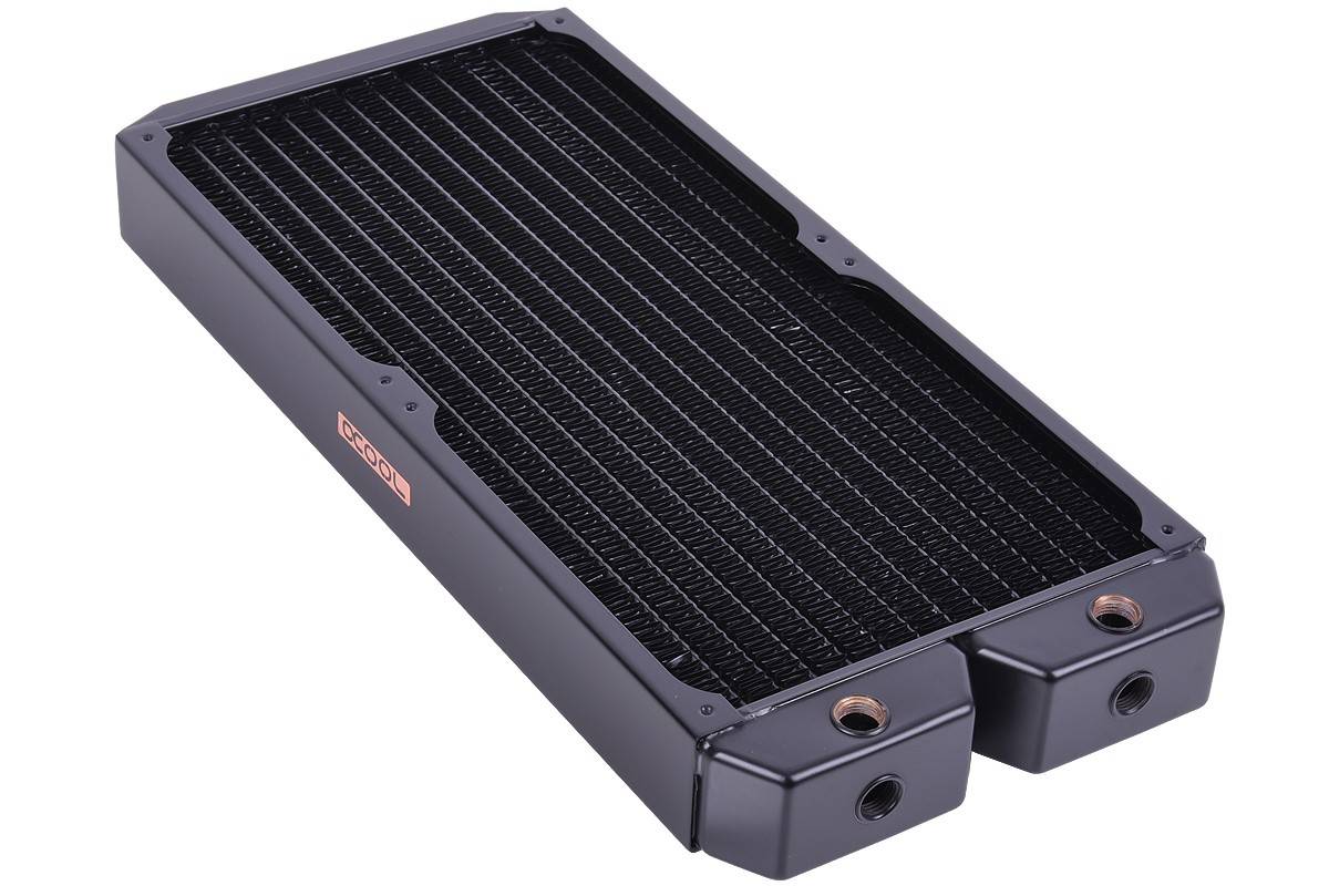 Der weltweit bekannte Hersteller Alphacool ist aktuell der einzige Hersteller weltweit der bei allen wasserführenden Teilen auf reines Kupfer setzt. Die Vorkammern, Wasserkanäle und die Finnen sind alle aus reinem Kupfer. Dadurch bieten Alphacool Radiatoren die höchste Wärmeleitfähigkeit, wodurch das Leistungslimit deutlich höher liegt als bei Aluminium Radiatoren. Kurz gesagt, die Kühlleistung ist schlichtweg höher, wenn man sehr viel Wärme abführen möchte. Kupfer ist im Wasserkühlungsbereich seit Jahren die beste Wahl bei den Materialien. Alle Alphacool Radiatoren sind für den Silent Betrieb ausgelegt. Sie benötigen also keine Lüfter mit besonders hohem statischen Druck, um die gewünschte Performance zu erzielen, sondern können auf normale Lüfter mit niedriger Drehzahl setzen. Der Performanceverlust gegenüber speziellen Lüftern für Radiatoren ist dadurch geringfügig und kann normalerweise ignoriert werden. Wer natürlich die maximale Kühlleistung erreichen will und auf angepasste Lüfter für Radiatoren setzt, wird natürlich auch nicht enttäuscht. Die maximale Performance leidet nicht darunter. Dank des Kupfers und dem qualitativ hochwertigen Herstellungsverfahren erhalten Sie auch mit Hochleistungslüftern immer noch eine enorme Leistungssteigerung für Ihre wassergekühlten Komponenten. Die Lüfter werden mit den beiliegenden 30 oder 35 mm M3 Schrauben montiert. Dabei bieten alle Alphacool Radiatoren einen Schutz, der verhindert, dass die Schrauben in die Kühlfinnen geschraubt werden können. Eine Metallplatte unterhalb der Bohrungen verhindert das weitere Eindringen der Schrauben. Um den Radiator direkt am Gehäuse zu montieren, liegen passende Schrauben im Lieferumfang bei. Alphacool deckt mit der NexXxoS Radiator-Reihe nahezu alle Größen ab und bietet in diesem Bereich das umfangreichste Portfolio aller Hersteller. Angefangen von 40 mm Dual Radiatoren bis hin zum Triple Radiator für 180 mm Lüfter. Dazu unterschiedliche Dicken: ST30, XT45, UT60 und Monsta, wobei die Zahl immer für die Dicke des Radiators in Millimetern steht und die Monsta Radiatoren ca. 86 mm dick sind. Darüber hinaus gibt es noch Sondergrößen und HPC Industrie-Radiatoren. Das sind spezielle Radiatoren, die auf einen hohen Druck ausgelegt sind. Die Anschlussmöglichkeiten bei den NexXxoS Radiatoren sind umfangreich. Während beim schmalen ST30 Radiator jeweils 2 Ein- und Auslässe vorhanden sind, bieten alle dickeren Radiatoren ab dem XT45 jeweils 3 Ein- und Auslässe im G ¼“ Format. Zusätzlich befindet sich an der hinteren Vorkammer noch ein G ¼“Anschluss zum Befüllen oder Entlüften. Dadurch haben Sie die Möglichkeit den Radiator in jeder gewünschten Position zu montieren. Eine Ausnahme stellen die X-Flow Radiatoren dar. Diese haben in der ST30 Version jeweils 2 Ein- oder Auslässe an beiden Vorkammern. Hier fließt das Wasser nicht in U-Form wie sonst üblich, sondern von einer Seite des Radiators zur anderen Seite des Radiators. Die Modelle ab der Größe XT45 haben wie gewohnt jeweils 3 Ein- oder Auslässe an den Vorkammern. So bieten Ihnen die X-Flow Radiatoren weitere Möglichkeiten den Wasserkreislauf in Ihrem System nach Ihren Wünschen anzupassen. Sie erhalten mit einem Radiator aus der Alphacool NexXxoS Serie einen einzigartigen Vollkupfer Radiator mit einer herausragenden Performance. Technische Daten Abmessungen (L x B x H) 403 x 182 x 45mm Anzahl Kühlkanäle 28 Kühlkanäle Kupfer Farbe schwarz Lüftergewinde M3 Anschluss 6x G1/4" Lamellen Kupfer Anzahl Lüfter 2 Dicke 39 - 49mm Gehäuse Stahl Druckgetestet 0,8 Bar Hersteller Alphacool Fins per inch 12 Lüftergröße 180mm