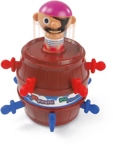 Das Beste an diesem Piraten: es gibt keine losen Teile, die Schwerter stecken fest im Fass! Drücke abwechselnd auf die Schwerter und mit etwas Glück, poppt der Pirat bei deinem Gegenspieler hoch (aber nicht raus!) und du gewinnst!