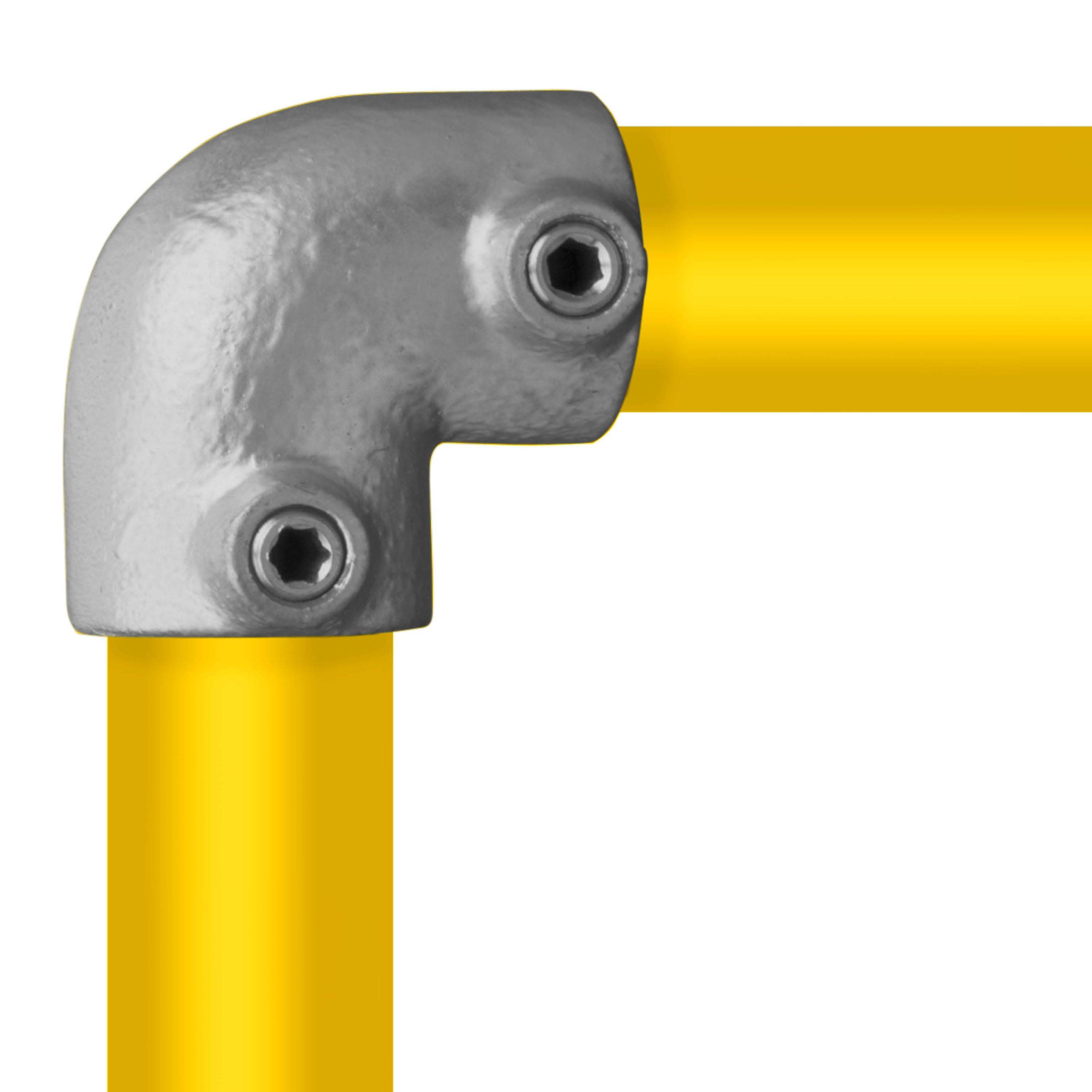 Der Rohrverbinder Typ 6 „Bogen 90°“ ist das klassische Kniestück zum Verbinden von zwei Rohren im rechten Winkel. Die