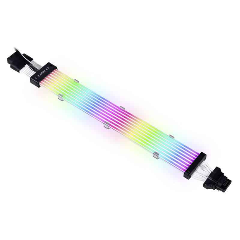 Das 12VHPWR-Verlängerungskabel ist zusätzlich mit acht Lichtleitern ausgestattet. Deren insgesamt 108 ARGB-LEDs können per beiliegendem 6-Pin auf 3-Pin-5VDG-Adapter direkt an ein Mainboard angeschlossen und mit der Software des Mainboard-Herstellers synchronisiert oder mit Lian Lis L-Connect 3-Software konfiguriert werden.