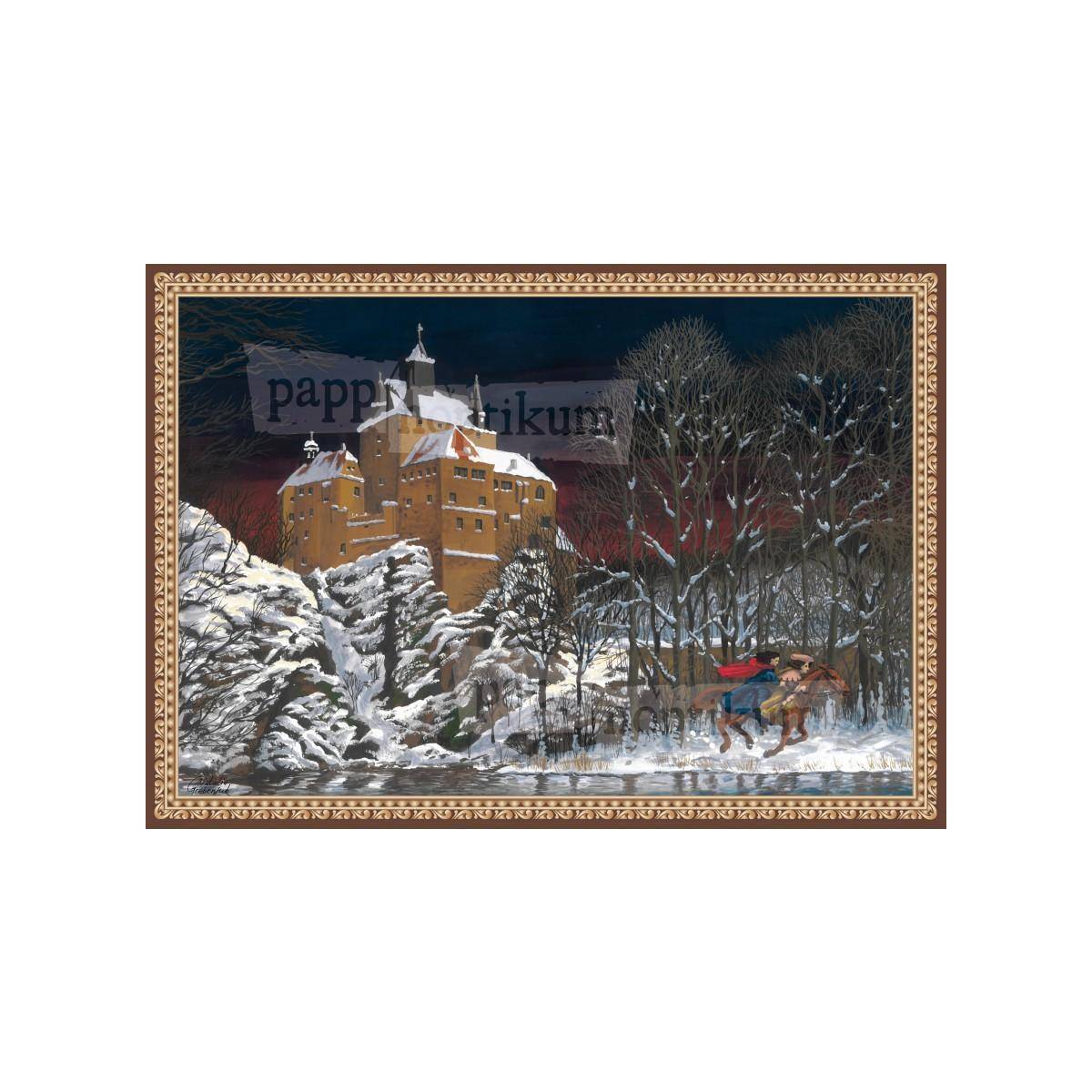 Mini-Adventskalender mit der Darstellung des Märchens Schneewittchen vor der beeindruckenden Kulisse der Burg Kriebstein. Es handelt sich um ein Veränder-mich-Motiv: mit jedem geöffneten Türchen entsteht Stück für Stück eine neue Bildkomposition. Lassen Sie sich überraschen!undnbsp;