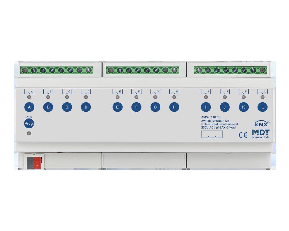 KNX Schaltaktor 12-fach, 12TE REG, 16 A, 230 V AC, C-Last, Strommessung, 140 µF. Standardausführung mit bistabilen Relais Strom max. 16 A, kapazitive Last max. 140 µF. Umfangreiche Funktionserweiterung. Integrierte True RMS Strommessung. Strommessbereich 10 mA ... 16 A. Integrierte Zählerfunktion des Energieverbrauchs (Wh/kWh). Schnelle Reaktion, < 1 s bei Master/Slave-Betrieb. Taster für Handbetrieb und LED Anzeige je Kanal. Zeitfunktionen (Ein-/Ausschaltverzögerung, Treppenlichtfunktion). Schwellwertschaltfunktion und Verbrauchsschwellwerte. Logische Verknüpfungen, 8 Szenen je Kanal. Betriebsstundenzähler. Erweiterte Statusfunktionen (invertiert, zyklisch, bei Sperre). Priorität/Zwangsführung mit automatischer Rückfallzeit. Einstellbares Verhalten bei Busspannungsausfall/-wiederkehr. 4 mm² Anschlussklemmen. Alle L-Anschlüsse getrennt. 3 Jahre Produktgarantie.