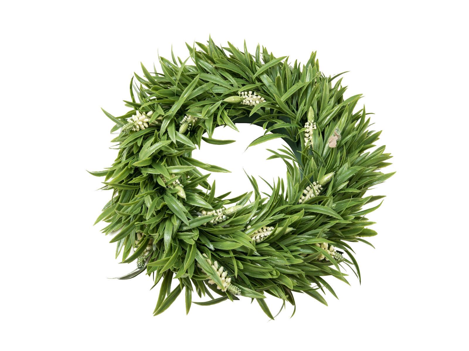 Der künstliche Lavendelkranz von Europalms hat einen Durchmesser von ca. 30 cm.Sein dichtes grünes Blattwerk und die weißen Blüten sind komplett aus PE gefertigt und deshalb auch für einen Einsatz im Außenbereich gut geeignet.Als Türkranz begrüßt er Ihre Besucher und Kunden oder verleiht als repräsentatives Deko-Element Ihrem Balkon, Ihrer Terrasse oder Ihren Wohnräumen im Handumdrehen ein ansprechendes sommerliches Ambiente.