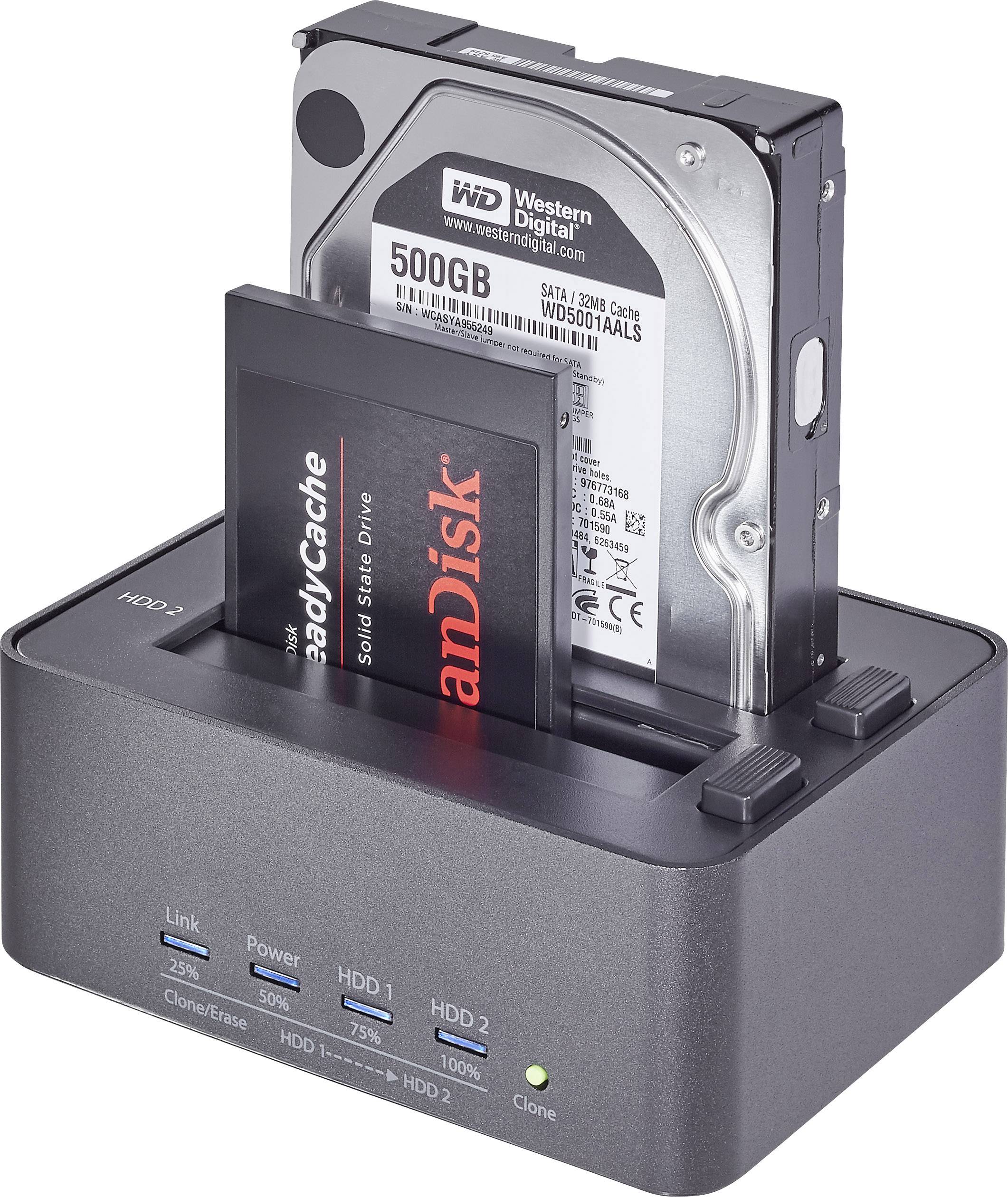 Mit dieser SATA-Dockingstation mit Clone- und Erase-Funktion können Sie bis zu zwei 6,4 cm (2,5“) und 8,9 cm (3,5“) SATA Festplatten an Ihren Computer anschließen ohne den PC zu öffnen oder ein externes Festplattengehäuse zu verwenden. Sie wird einfach mit dem im Lieferumfang enthaltenen USB 3.0 Kabel an dem Computer angeschlossen. Mittels LED werden Stromversorgung und Datenfluss angezeigt und durch Drücken der Auswurftaste wird die Verbindung getrennt und die Festplatte kann entnommen werden. Bei Anschluss von zwei Festplatten kann die Clone-Funktion verwendet werden um die Festplatten ohne PC zu klonen.