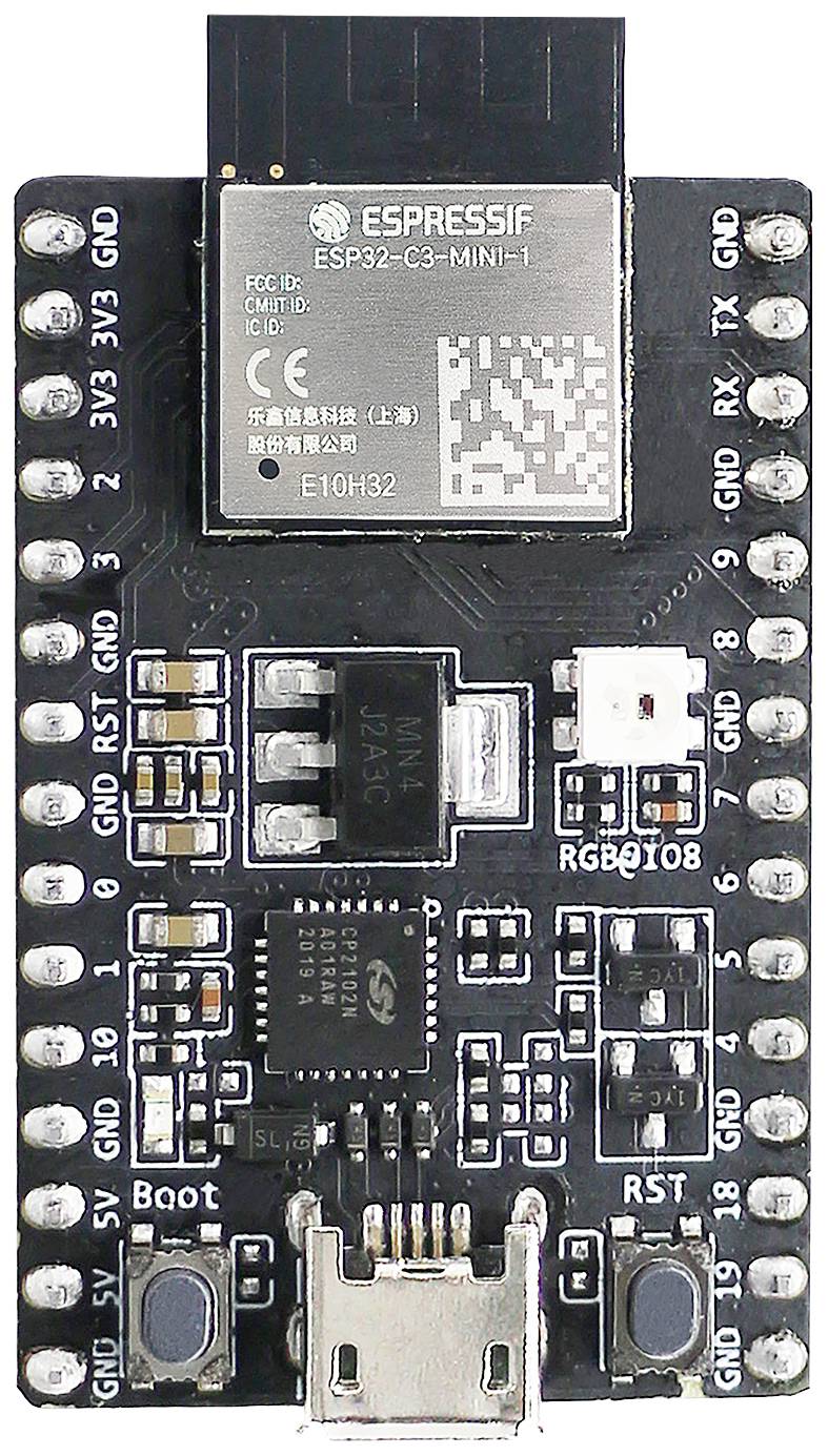 ESP32-C3-DevKitM-1 ist ein Entwicklungsboard der Einstiegsklasse, das auf ESP32-C3-MINI-1 basiert , einem Modul, das nach seiner geringen Größe benannt ist. Dieses Board integriert vollständige Wi-Fi- und Bluetooth® Low Energy-Funktionen.