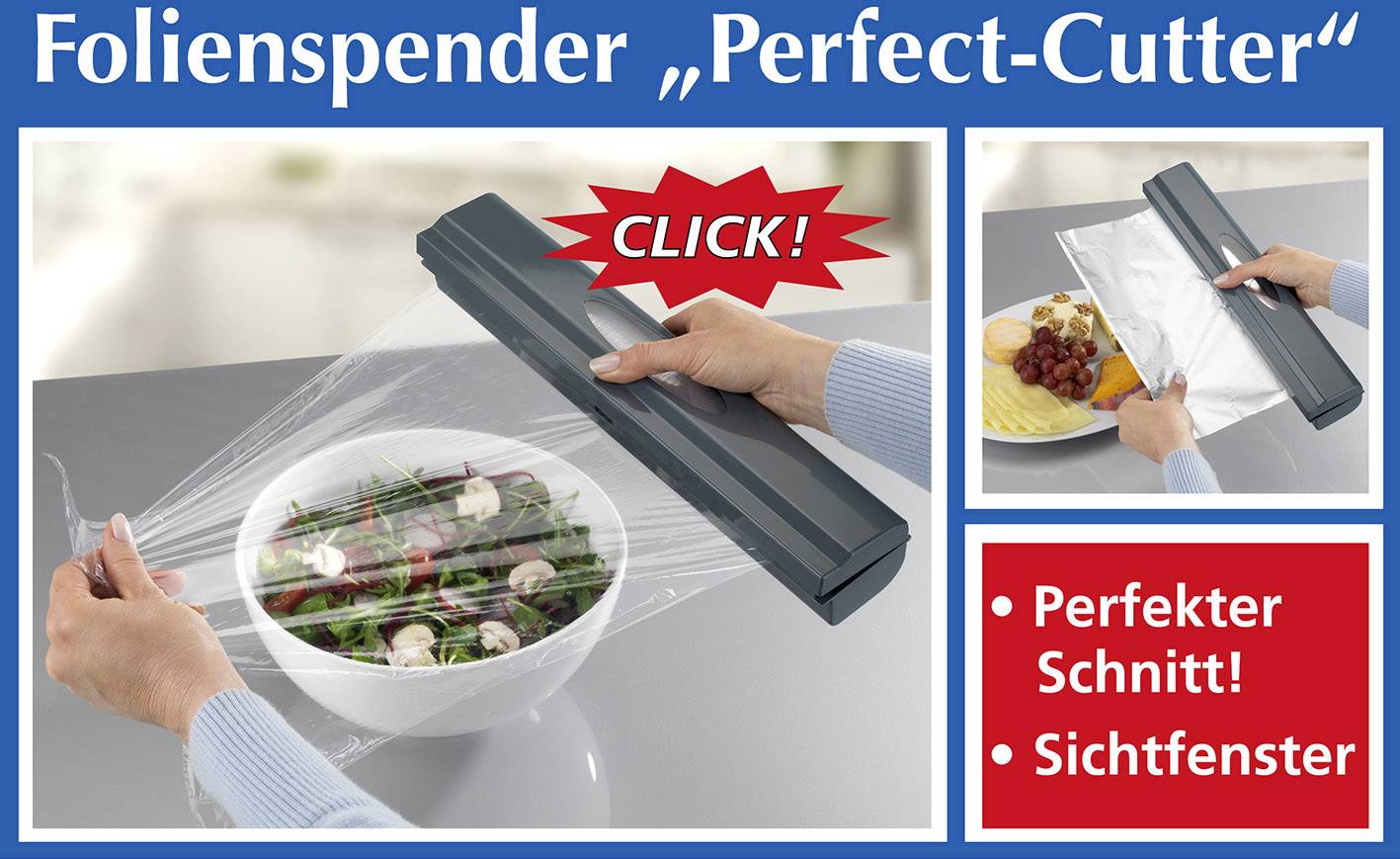 Die Zeiten von ständig zerrissener Frischaltefolie ist dank dem Folienspender Perfect-Cutter nun endlich vorbei! Die Bedienung ist dank des Federmechanismus kinderleicht. Einfach die Folie herausziehe, auf Spannung halten und den Spender zusammendrücken. Die fein gezahnte Edelstahl-Klinge im Deckel trennt die Folie schnell und sauber ab. Der Spender verfügt über einen Deckel mit Sichtfenster - so behalten Sie stets den Überblick über Ihren Vorrat. Zusätzlich ist der Perfect-Cutter verstellbar un dkann für alle handelsüblichen Rollen bis 30 cm Breite verwendet werden. Er ist ideal zum Aufbewahren Ihrer Frischhaltefolie in der Schublade geeignet.