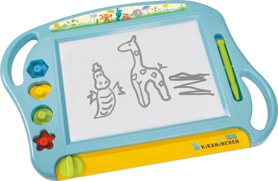 Wie von Zauberhand lassen sich kreative Bilder auf der KiKANiNCHEN Maltafel zeichnen und wieder löschen. Betätigt man den Schieber, verschwindet das Bild und der Malspaß kann von vorn beginnen. Vier tolle Magnetstempel sorgen für noch mehr Kreativität und versprechen schöne Bilder. Der Magnetstift ist an einer Schnur befestigt und kann in ein separates Fach gelegt werden.