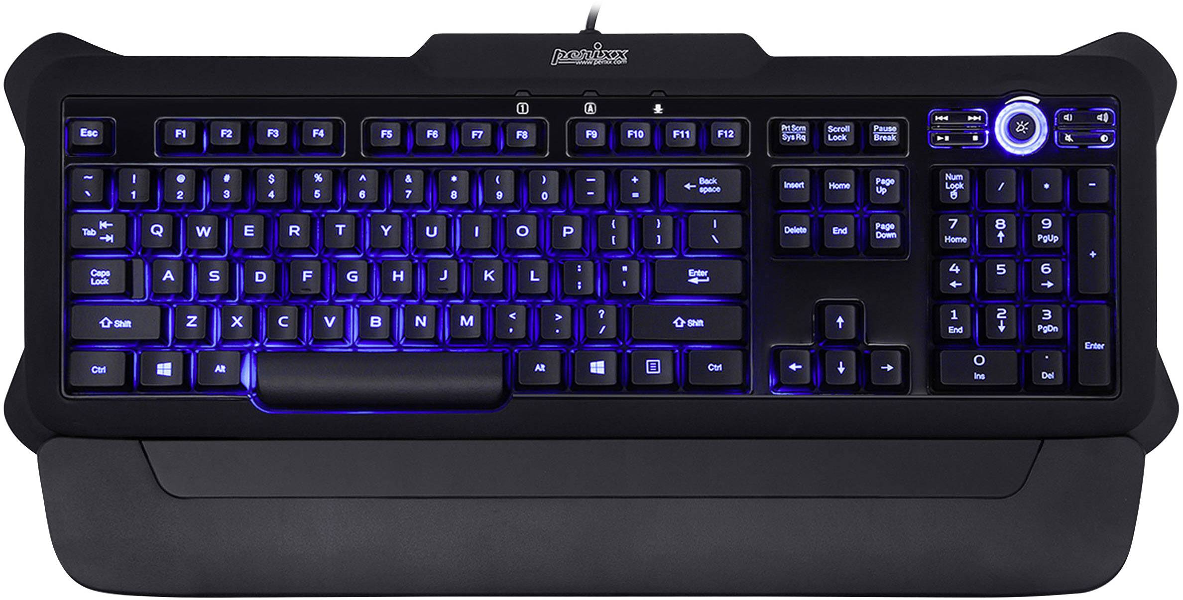 Die PX-1100 ist ein Bestseller unter den Gaming Keyboards, ihre Rückbeleuchtung in Rot, Blau oder Lila die man am Helligkeits-Rad verstellen kann, macht sie zu einem wahren Hingucker.